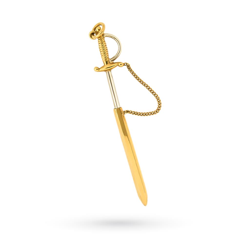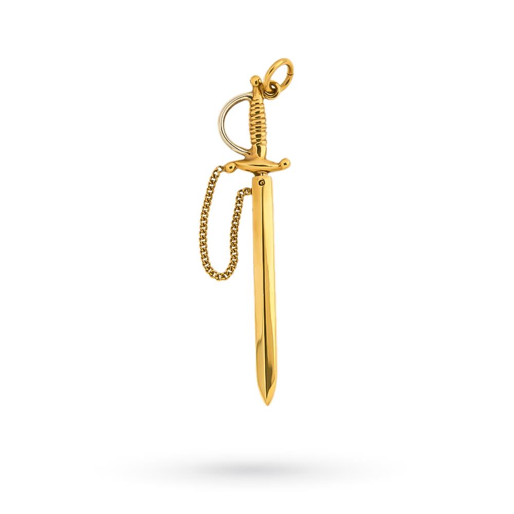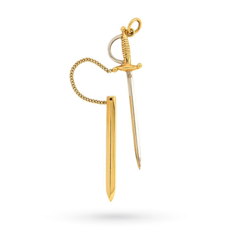 Il ciondolo spada con elsa che stai osservando è realizzato in oro giallo e bianco 18kt.