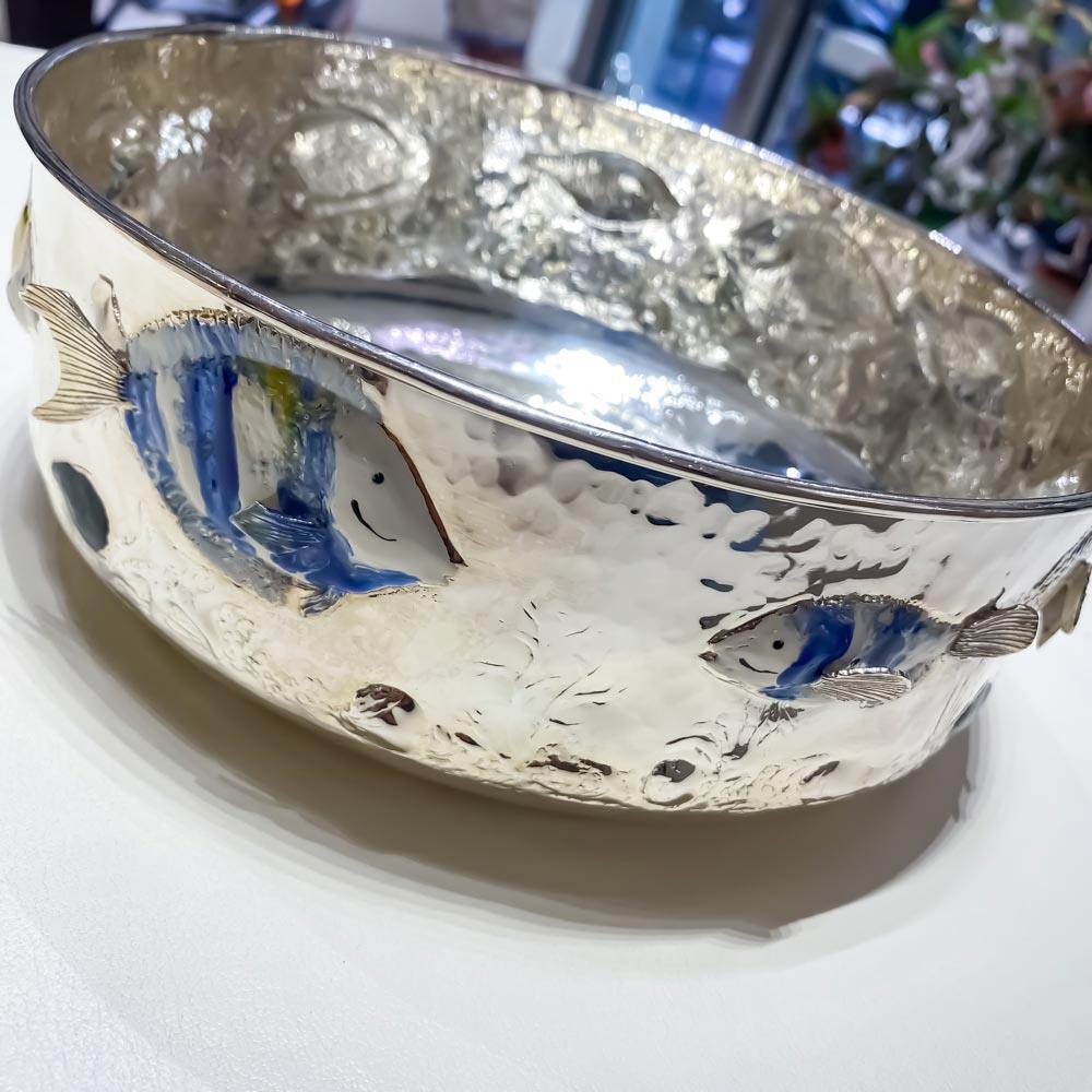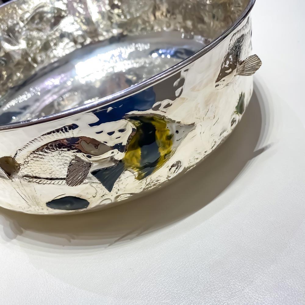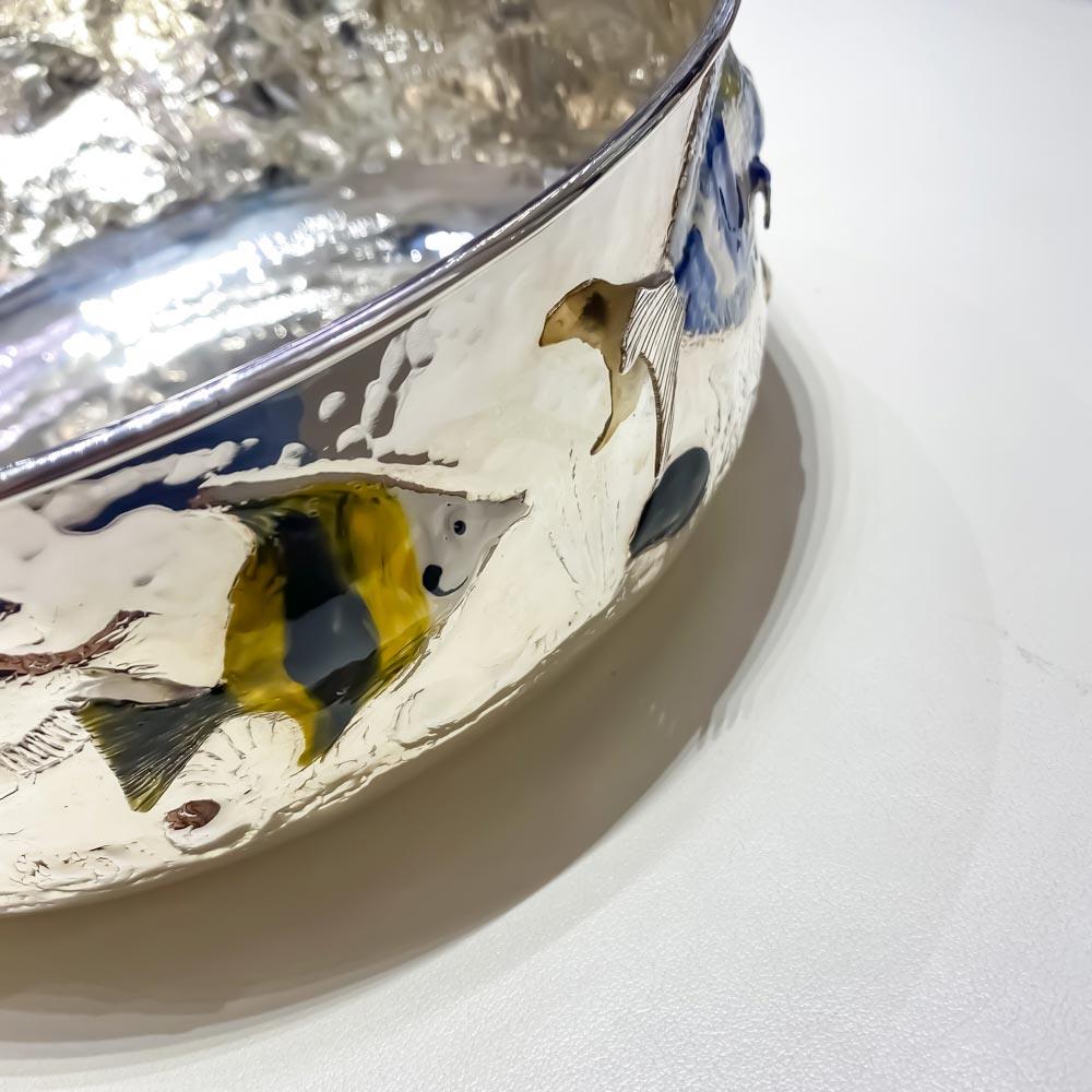 La lavorazione leggermente martellata del vaso gli conferisce lo stesso effetto dell'acqua: il gioco di riflessi che si crea sembra quella di un prezioso acquario con pesci.