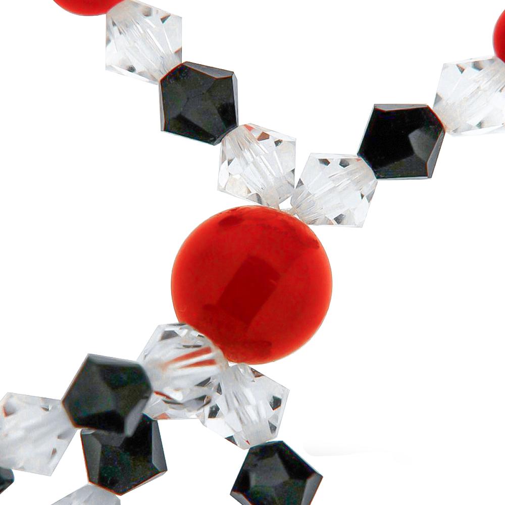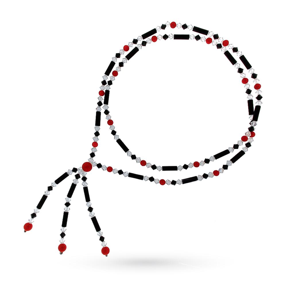 Collana lunga sfere corallo elementi onice cristallo. Cicala.it presenta oggi questa splendida creazione di gioielleria: un girocollo modello chanel (molto lungo) composto da un unico filo impreziosito da cristalli, corallo rosso e onice. Il terminale si divide in tre singoli fili pendenti, anch'essi riportanti la stessa finitura alternata di barre di onice, segmenti di cristallo sfacettato e sfere lucide di corallo rosso.