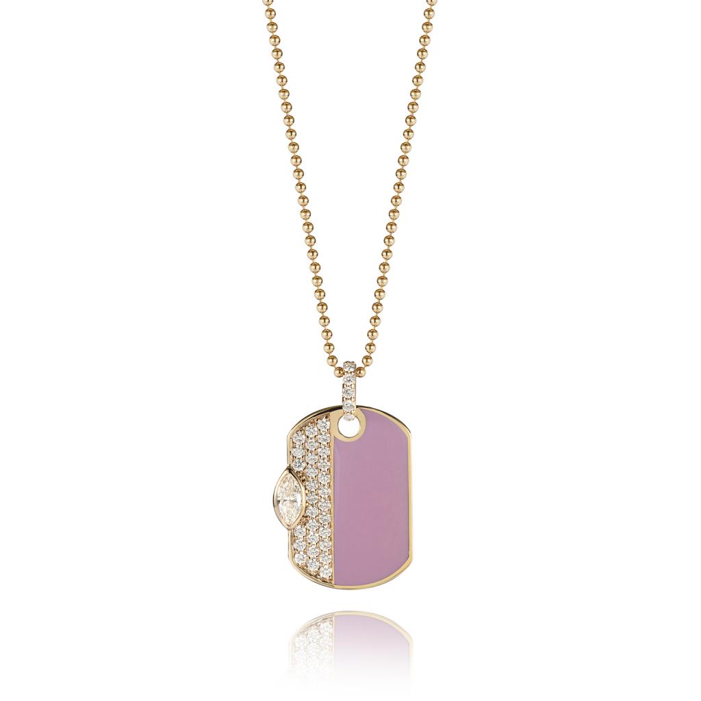 Il gioiello che stai osservando è una collana della marca RF Jewels. Catena con medaglia interamente in oro giallo 18kt con smalto rosa e diamanti taglio rotondo brillante 0,29ct e laterale un diamante taglio marquise 0,22ct.