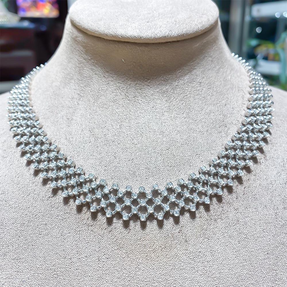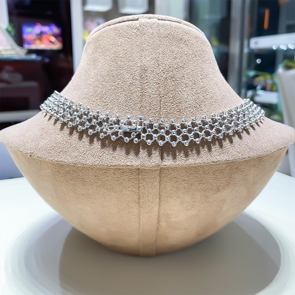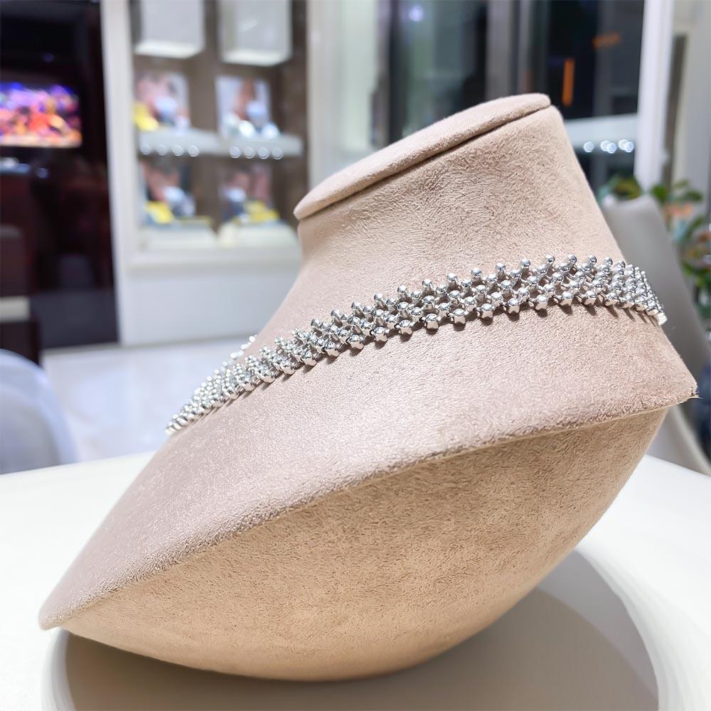 Questa straordinaria collana firmata Giorgio Visconti è una creazione d’alta gioielleria capace di unire eleganza, innovazione e artigianalità italiana. Realizzata interamente in oro bianco 18kt, presenta una struttura unica: l’oro viene lavorato con una tecnica speciale che crea l’illusione di un tessuto morbido, flessibile, luminoso, pur mantenendo la robustezza e la solidità del metallo prezioso.
