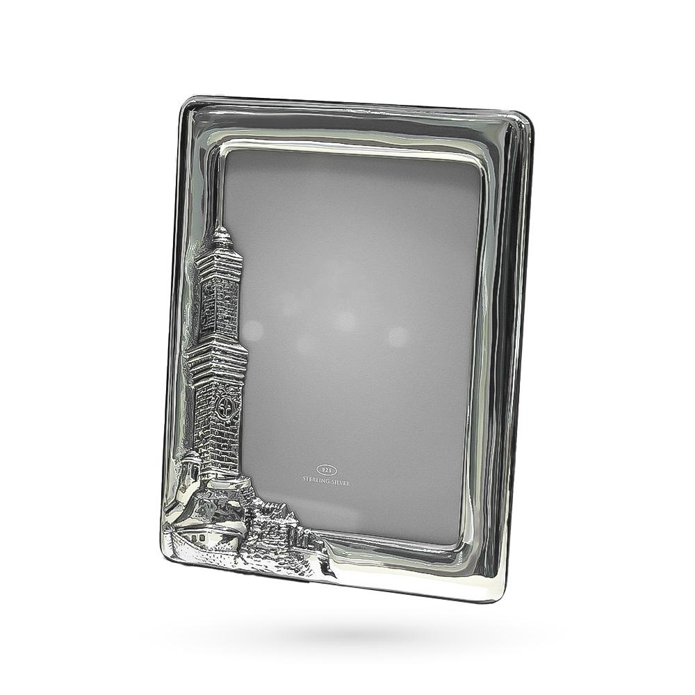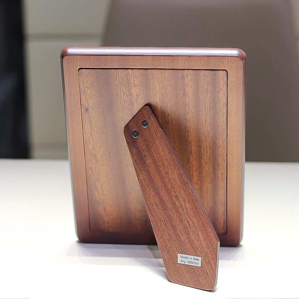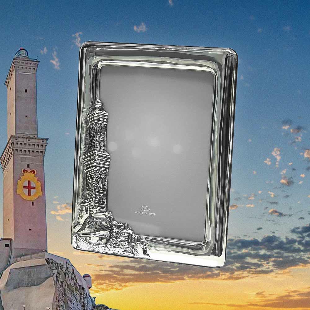Cornice portafoto argento 13x18 cm Lanterna Genova. La cornice portafoto che stai osservando è una prestigiosa creazione artigianale ed esclusiva realizzata da Cicala in argento 925. Questa elegante realizzazione è stata ideata e realizzata intearmente a mano partendo da un disegno del simbolo della città . Su di esso, le abili mani di maestri argentierti artigiani hanno lavorato e plasmato una spessa lastra d'argento per realizzare la Lanterna di Genova in rilievo. Battuta interamente a mano con l'ausilio di piccoli martelli e ceselli, questa scultura impreziosisce l'angolo in basso a sinistra della cornice, rendendola un iconico elemento d'arredo capace di catturare l'attenzione dell'osservatore. Consente l'inserimento di fotografie con dimensione 13 x 18cm. Retro in pregiato legno marrone.
