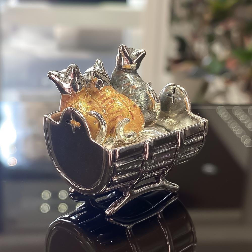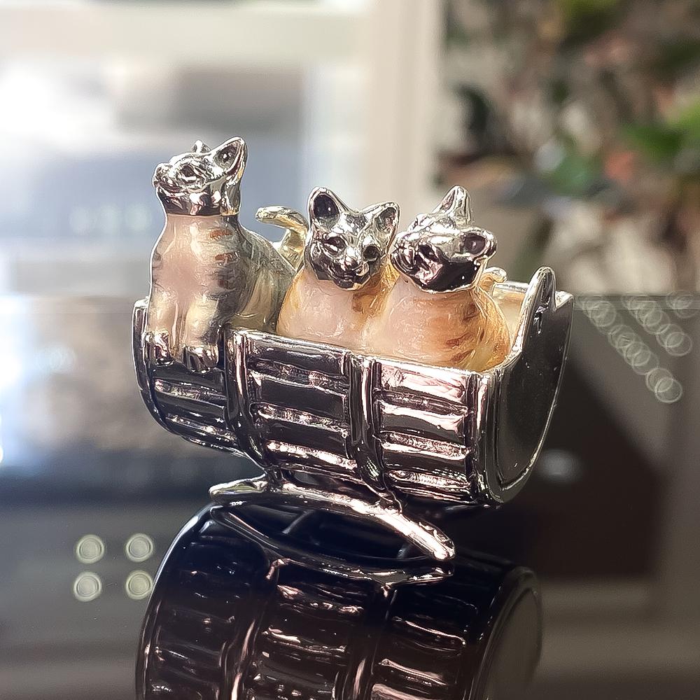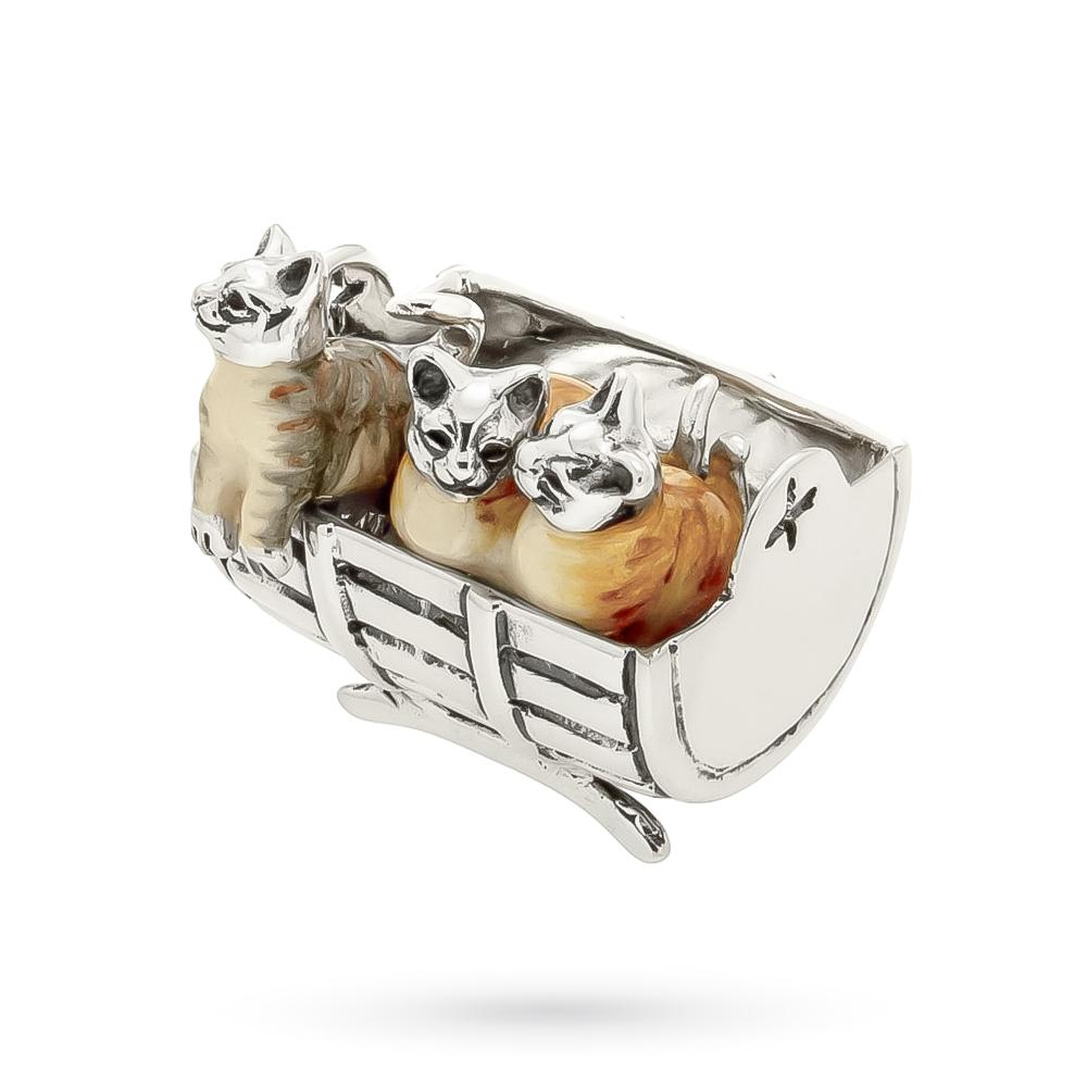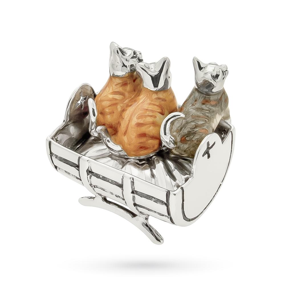 Gatti nella cesta soprammobile argento 925 smalto. Il soprammobile "gattini nella cesta" è una creazione del Brand Saturno, eccellenza italiana del Made in Italy. Saturno realizza capolavori, artigianali in argento tutti diversi tra loro grazie alle sfumature delle smaltature applicate a mano: non esisteranno mai due Soprammobile uguali tra loro. Questi Soprammobile in argento sono l'ideale per i collezionisti di oggetti esclusivi e per chi ama arredare la propria casa o il proprio ufficio con elementi d'arredo ricercati e preziosi.