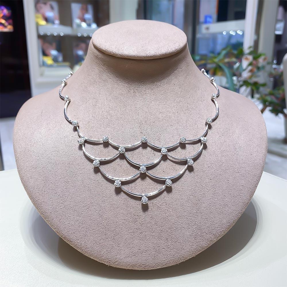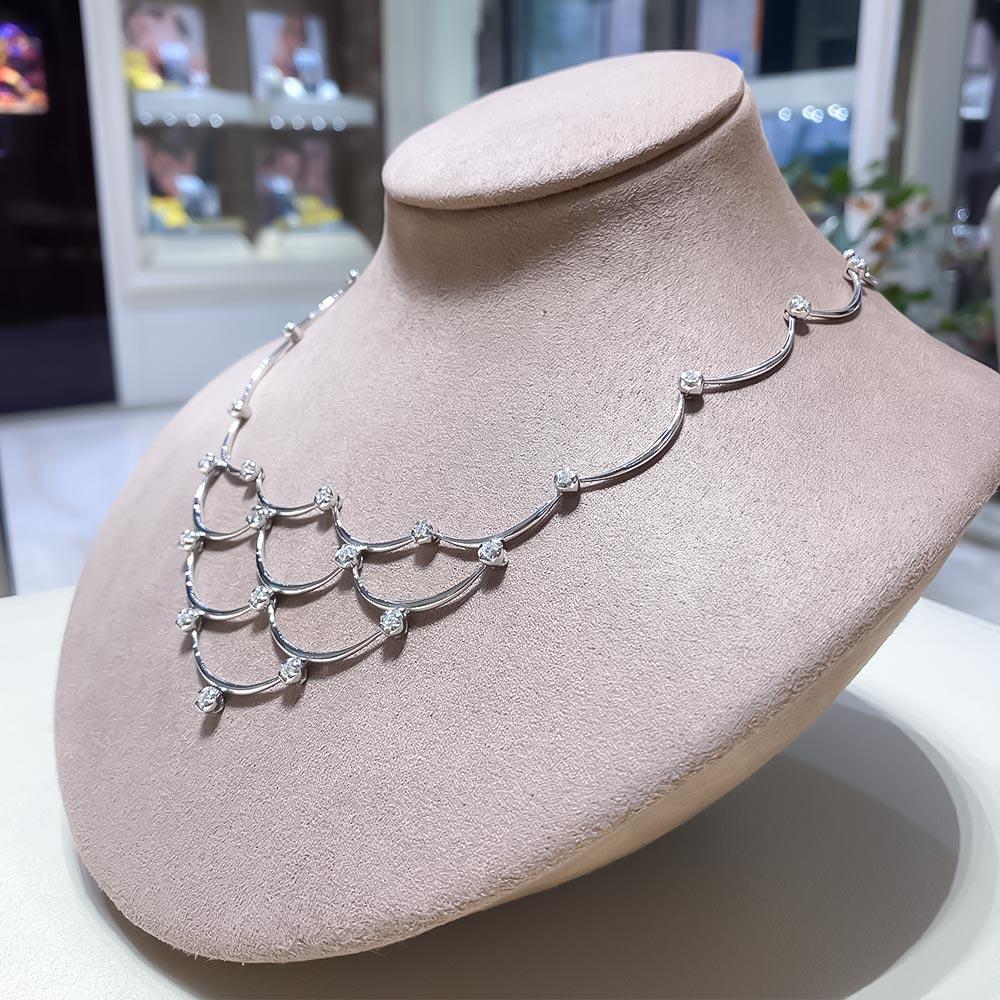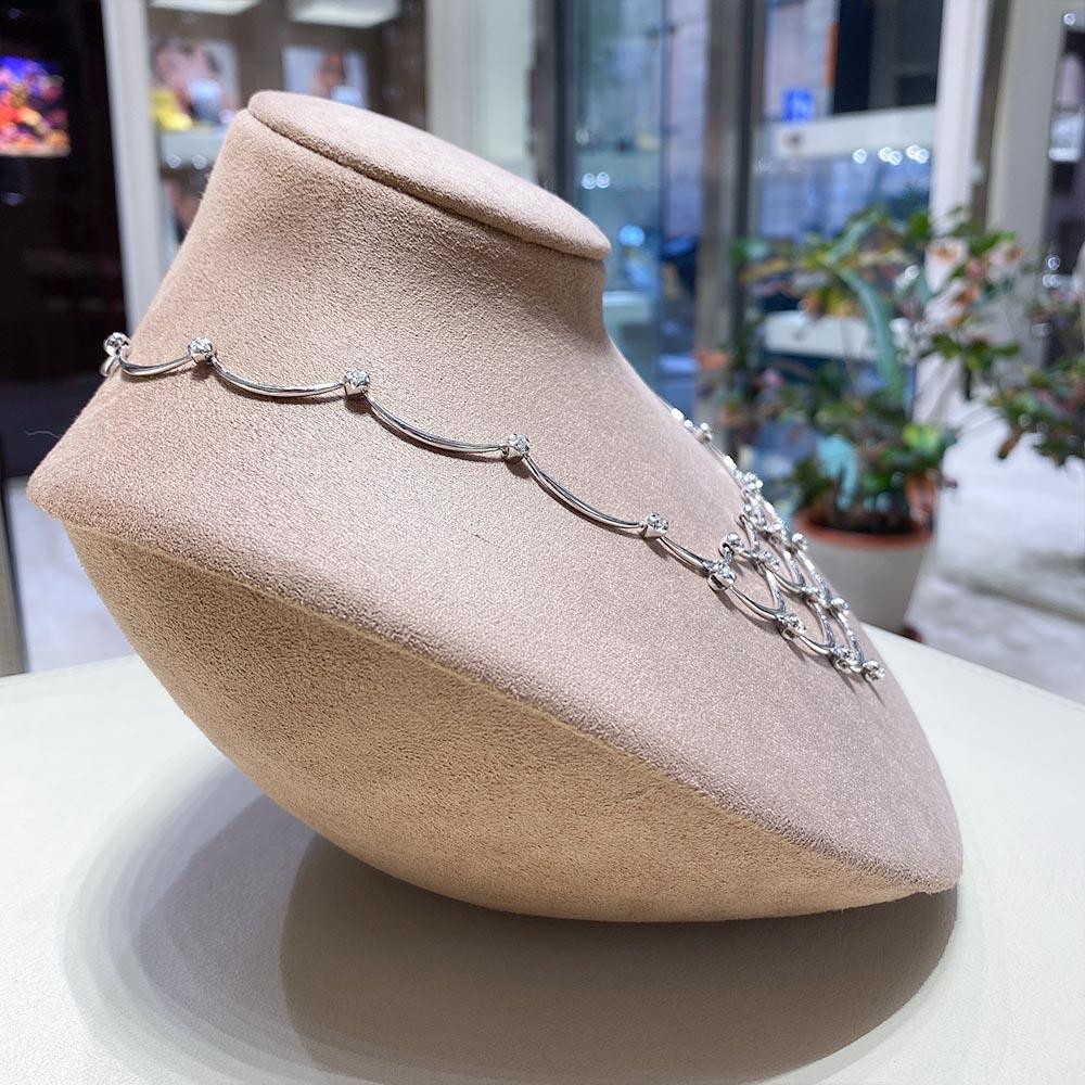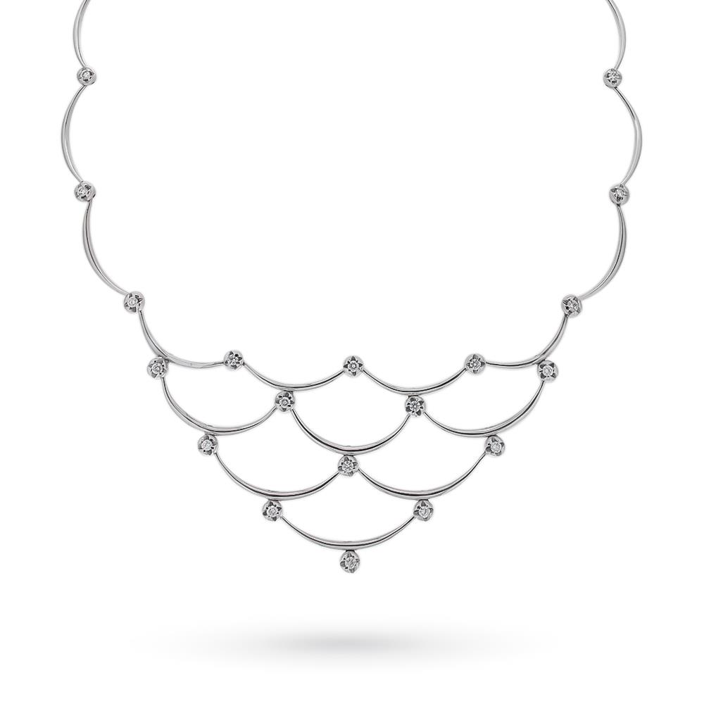 Girocollo archi rigidi oro bianco diamanti 1,25ct è una creazione Giorgio Visconti. Questa collana a girocollo è realizzata da tanti segmenti d'oro bianco rigidi a forma di arco. Ogni segmento è impernato su quello successivo, ed impreziosito da un diamante nella giuntura. Il risultato è una collana a girocollo rigida ma morbida, che si adatta al collo di chi la indossa. E' un gioiello perfetto per esser indossato in occasioni speciali come il matrimonio, o su vestiti da sera per impreziosire in maniera esclusiva il proprio look.