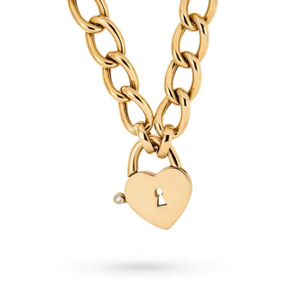 Il gioiello che stai osservando è un elegante girocollo realizzato in prezioso oro giallo 18kt lucido. Questa creazione è composta da una grande catena e da una chiusura "a scomparsa" composta da un lucchetto apribile a forma di cuore.