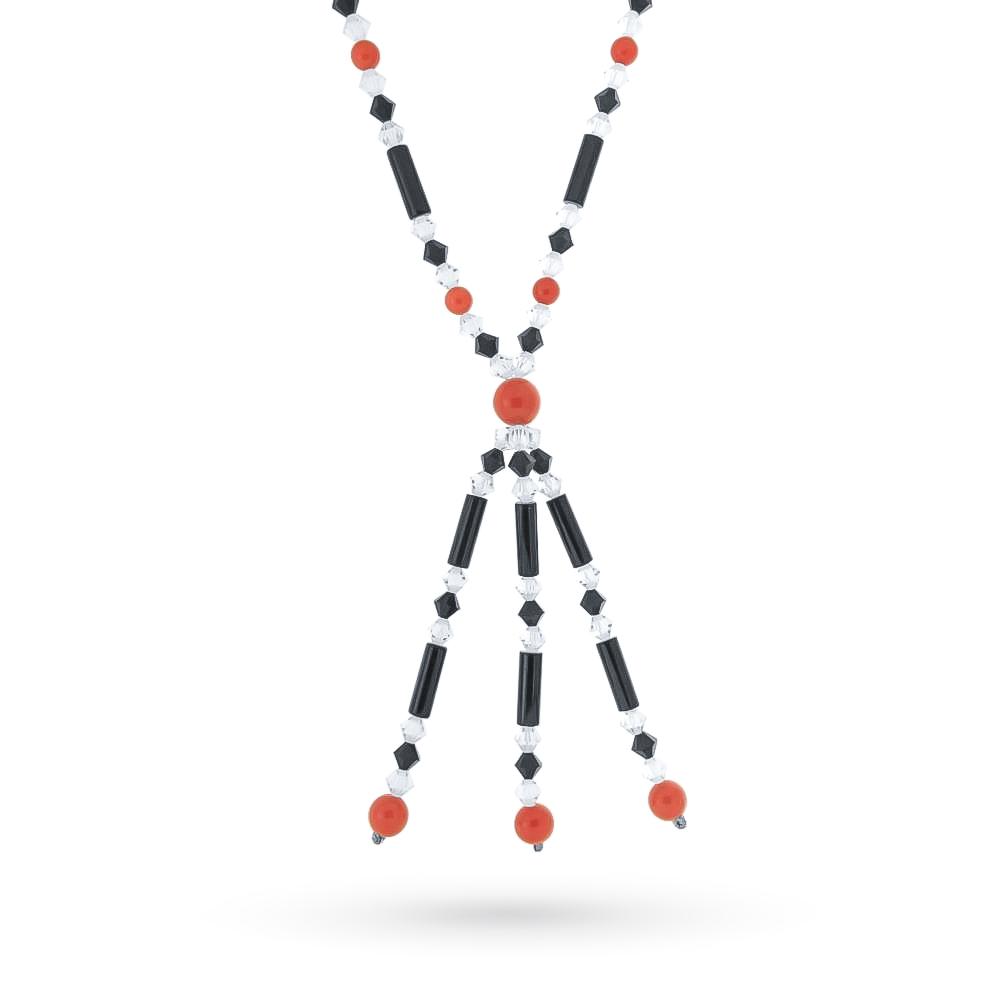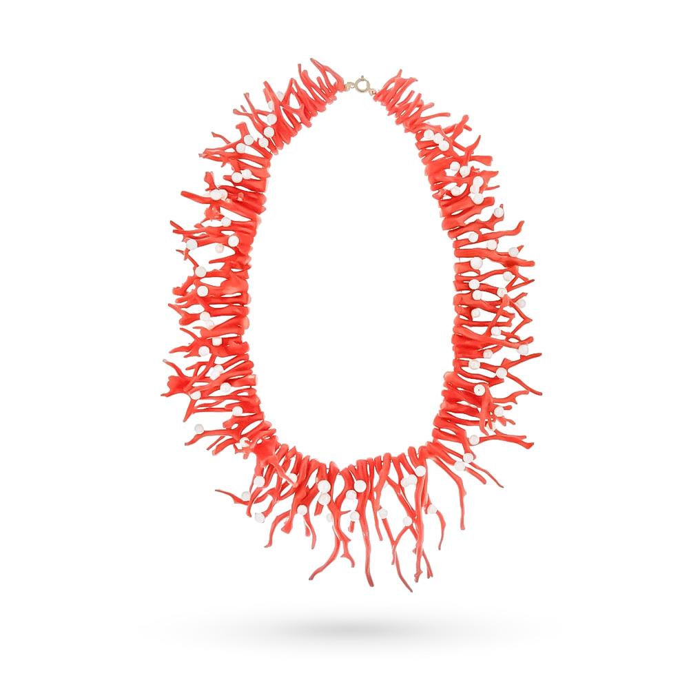Girocollo elementi corallo rosso naturale perle. Questo gioiello è una creazione esclusiva firmata Cicala. E' creata attraverso una sapiente infilatura di tantissimi piccoli rami di corallo rosso mediterraneo, anche chiamate frange di corallo, abilmente lucidate. Questa creazione è abbellita ulteriormente dalla presenza sparsa di tante piccole perle naturali fresh water di colore bianco. E' un gioiello in grado di catturare l'attenzione dell'osservatore: una volta indossato, grazie al suo movimento e al suo colore, il girocollo diventa il protagonista del look. Grazie all'unicità degli elementi utilizzati non esisterà mai al mondo un altro gioiello identico a questo. E' una perfetta idea regalo per le amanti del colore rosso e del mare. Consegna con scatola e garanzia.