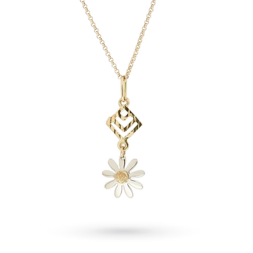 E' presente un ciondolo in oro giallo e bianco a forma di margherita con elemento rombo sopra.
