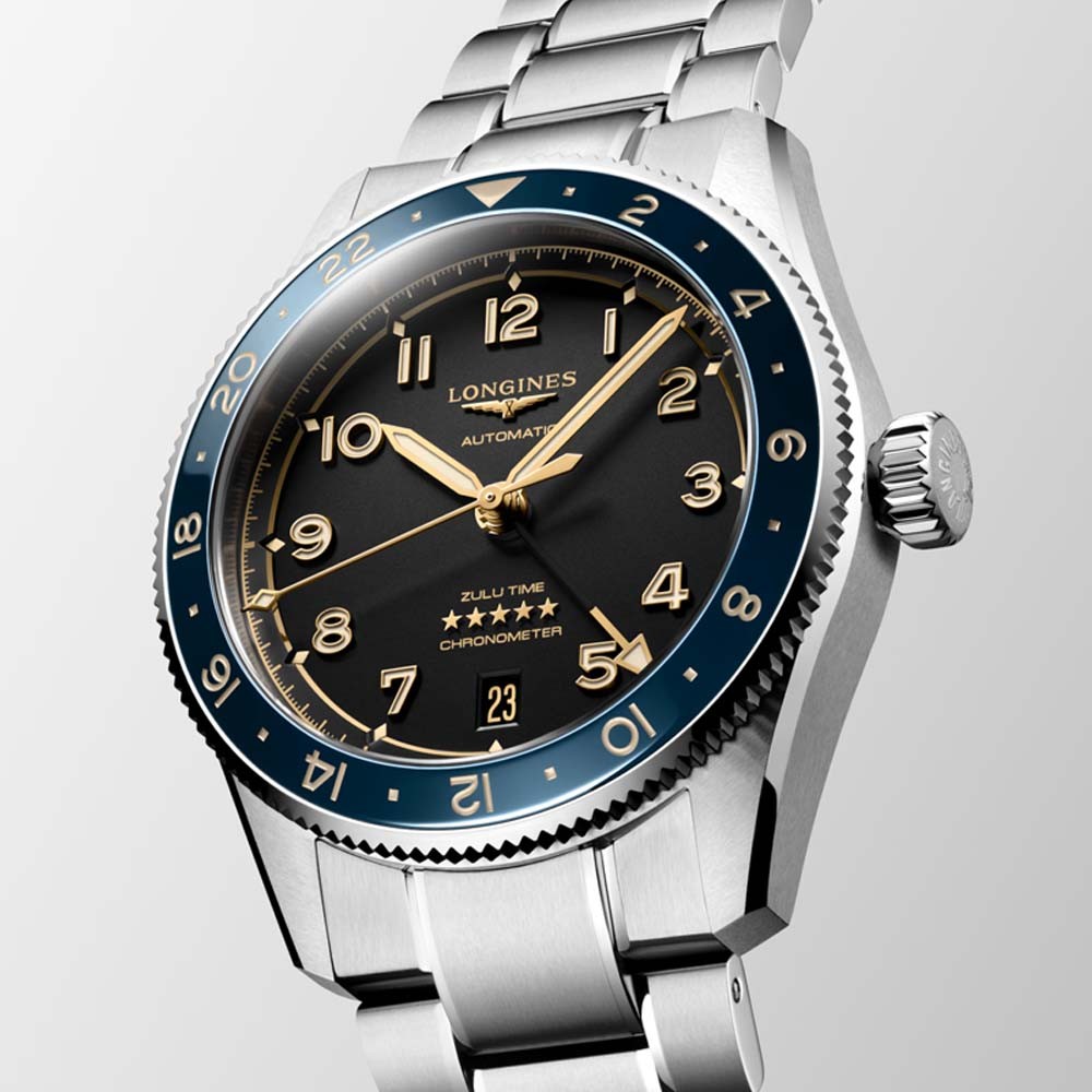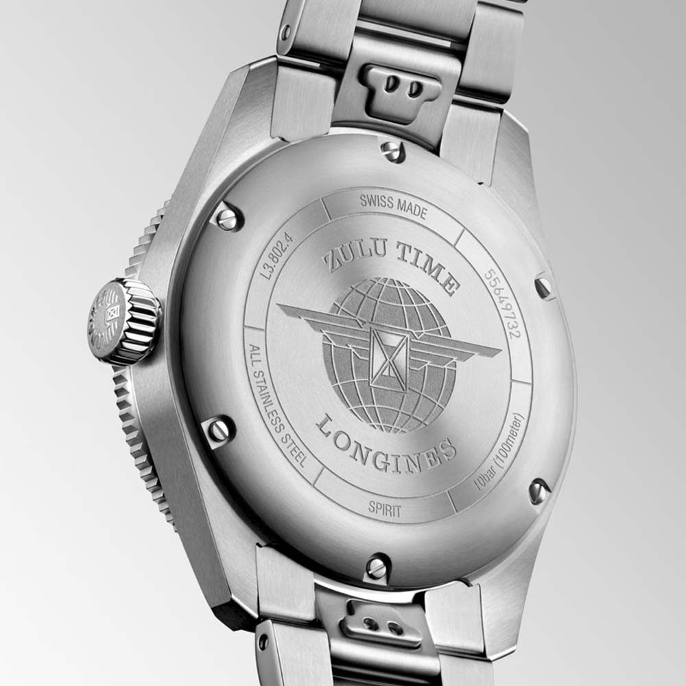 Bracciale in Acciaio inossidabile, Con chiusura déployante a doppia sicurezza e meccanismo di apertura a pressione. Il LONGINES Spirit Zulu Time simboleggia la maestria centenaria del marchio negli orologi con più fusi orari. Le sue origini e il suo nome derivano dal primo orologio da polso LONGINES con due fusi orari, realizzato nel 1925, che presentava la bandiera Zulu sul quadrante (dove Zulu si riferisce alla lettera “Z” che indica il tempo universale per gli aviatori). Esteticamente, il LONGINES Spirit Zulu Time si distingue per l’esecuzione meticolosa e la particolare cura dei dettagli. Presenta una lunetta girevole bidirezionale con inserto in ceramica. Ogni modello è alimentato da un esclusivo calibro LONGINES, dotato di un bilanciere-spirale in silicio, resistente ai campi magnetici e certificato come cronometro COSC.