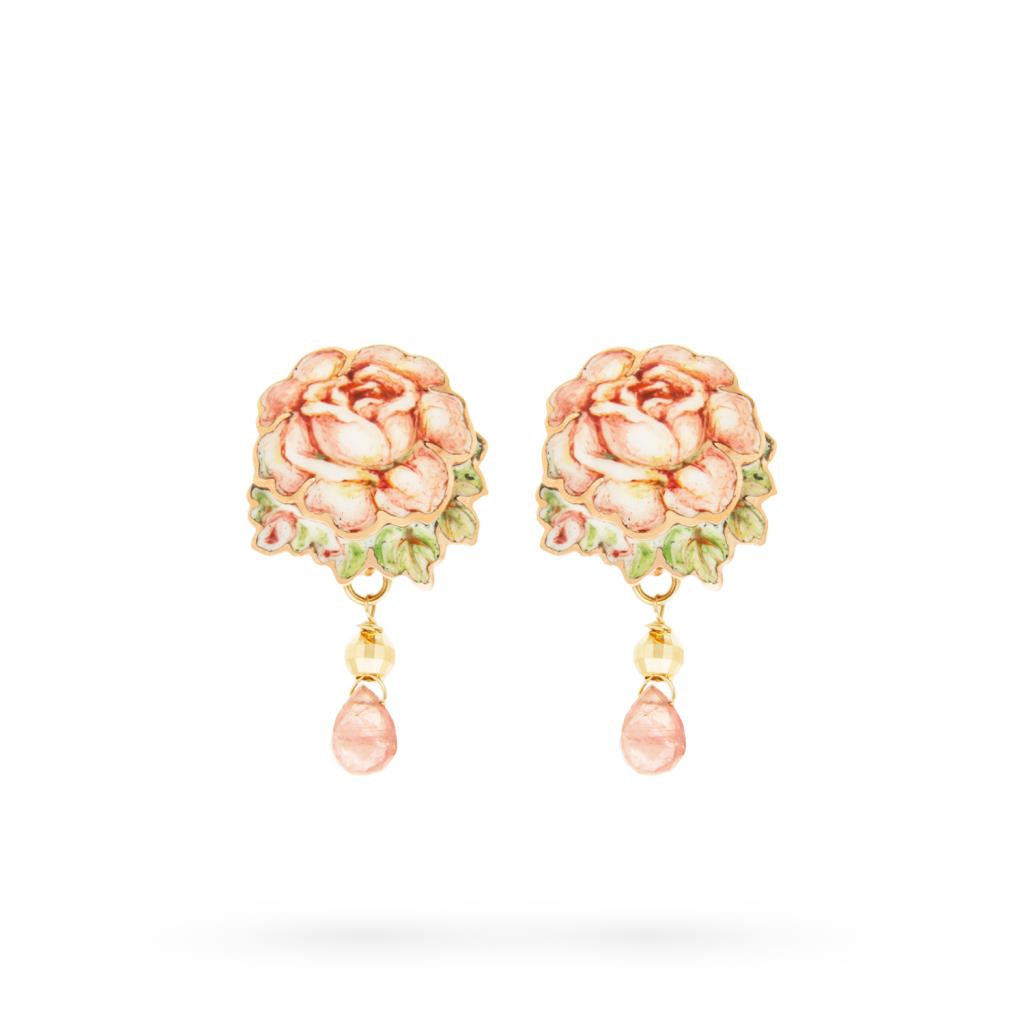 I fiori, in questo caso due rose con foglioline, sono in smalto e dipinti a mano. La loro base è in rame. Gli orecchini sono abbelliti con pendenti in oro giallo 18kt e tormaline rosa.