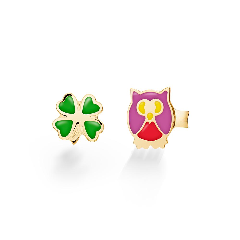 Questi orecchini leBebe della collezione Primegioie, in oro 9kt, grammi 0.7, con sagome a forma di quadrifoglio e civetta, smaltate con colori vicaci. Questi orecchini sono l'ideale da regalare in occasione di un battesimo. Grazie al sito Cicala.it potrai acquistare i gioielli che desideri comodamente da casa tua, ottimizzando il tuo tempo al meglio e avendo la garanzia di ricevere i tuoi gioielli accompagnati da scatola e garanzia del marchio.
