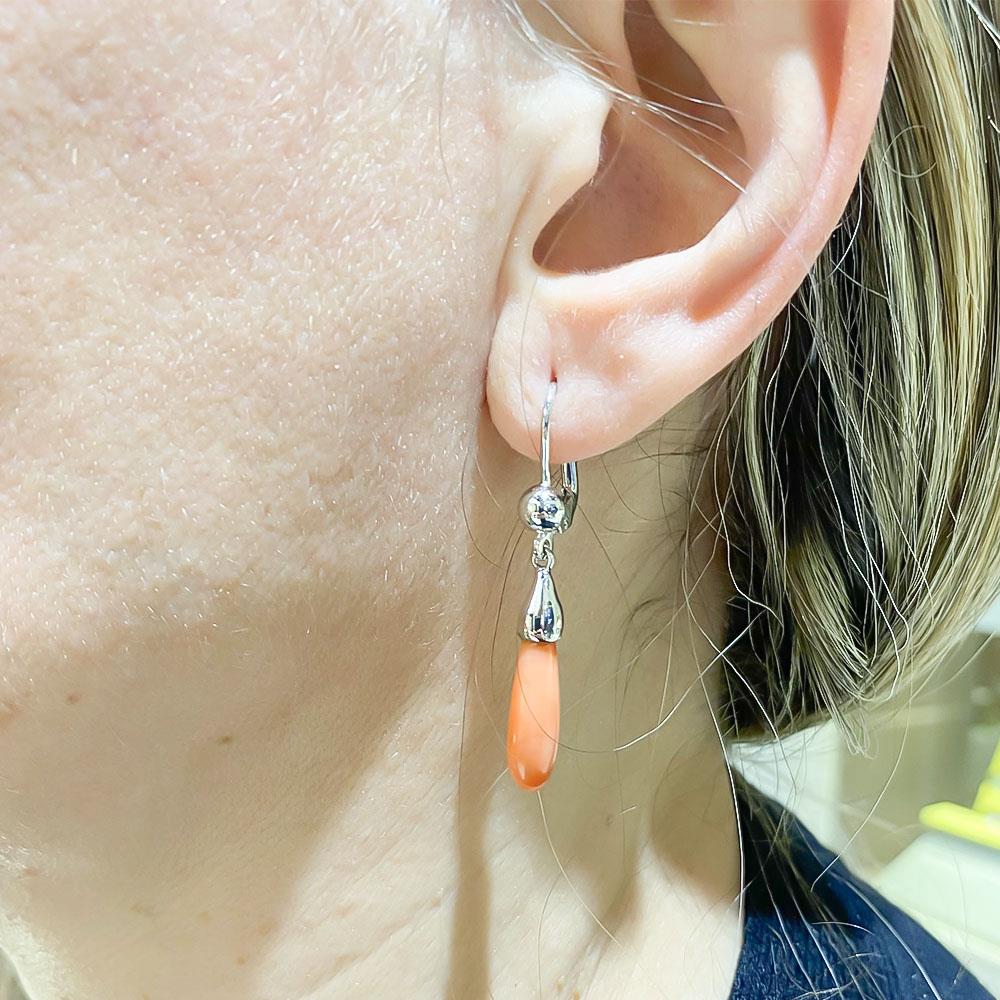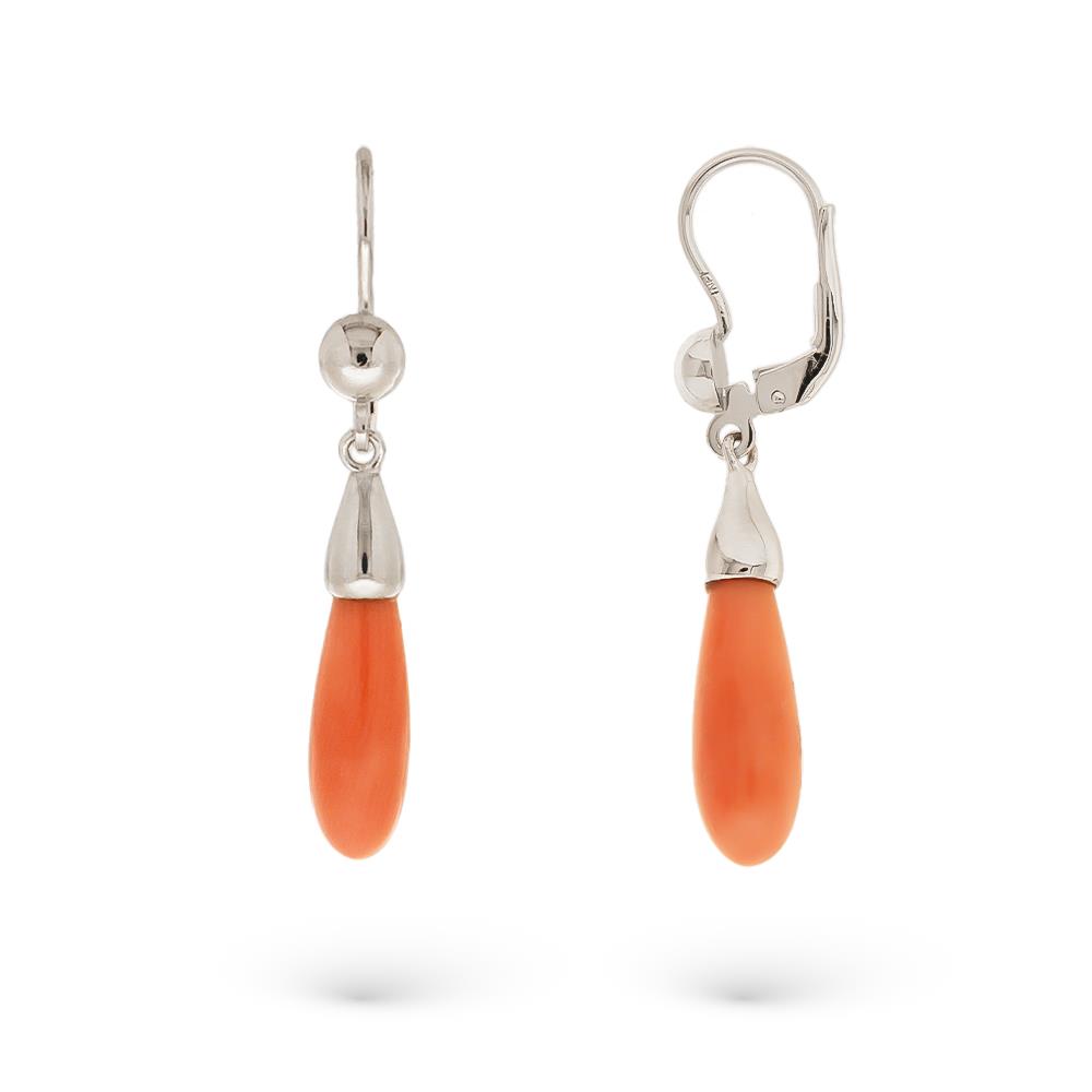 Orecchini monachelle gocce corallo 16mm oro bianco 18kt.