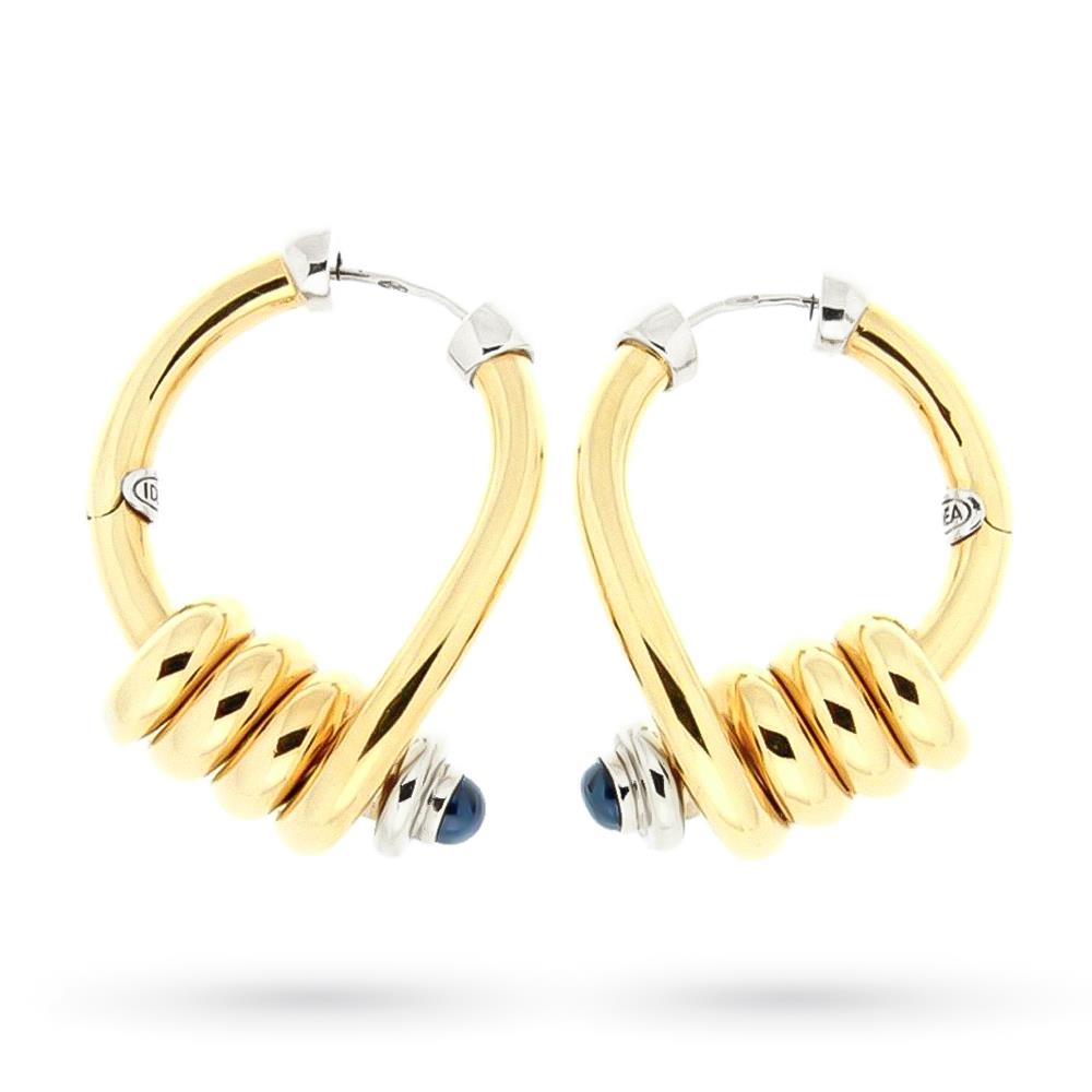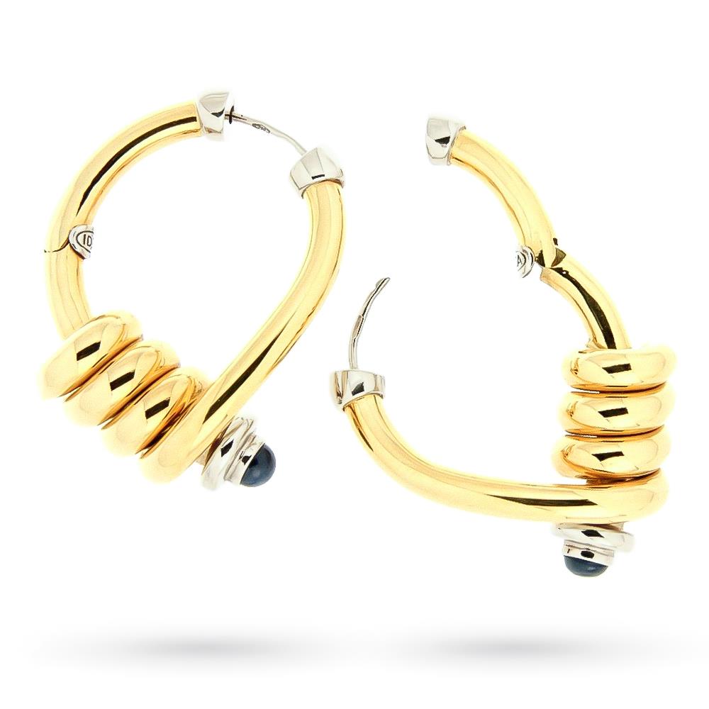 Orecchini oro giallo pendenti spirale zaffiri cabochon. Questi orecchini sono una variante dei classici orecchini a cerchio. Sono una fantastica creazione made in Italy, assolutamente innovativi e preziosi: l'oro si avvita su sè stesso come per magia creando un cerchio particolarissimo impreziosito ulteriormente dal terminale con zaffiro blu. Il materiale utilizzato è oro giallo 18kt con peso complessivo 18,60 grammi; le gemme sono zaffiri blu taglio cabochon, profondi e intriganti. Il gioiello è accompagnato da scatola regalo e garanzia. Cicala omaggia una copertura assicurativa sulla spedizione.