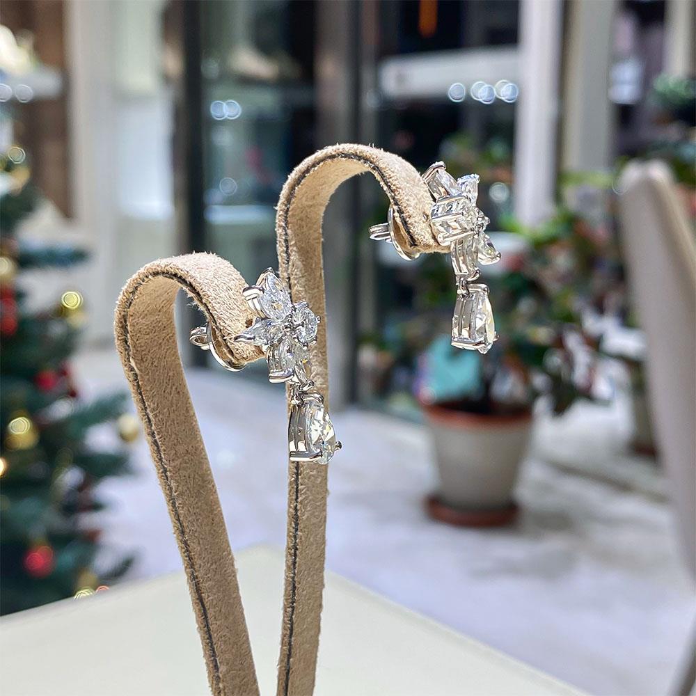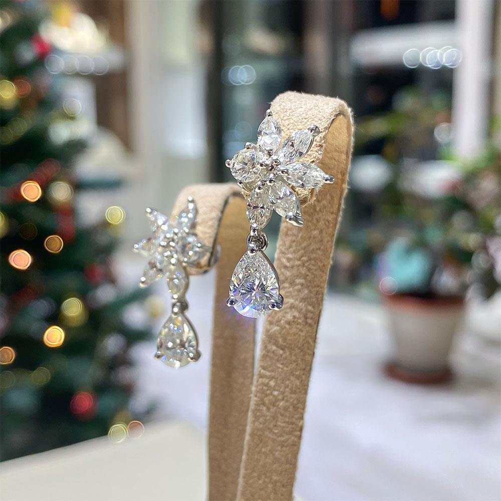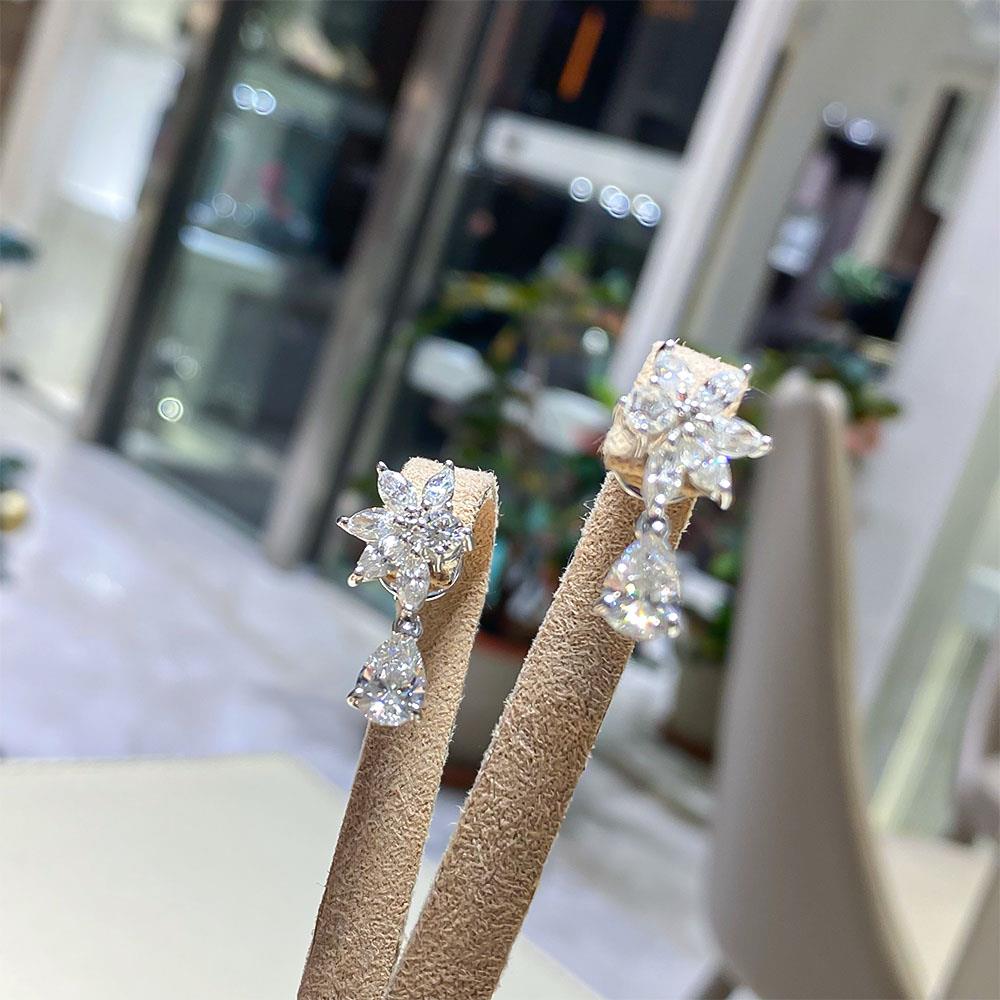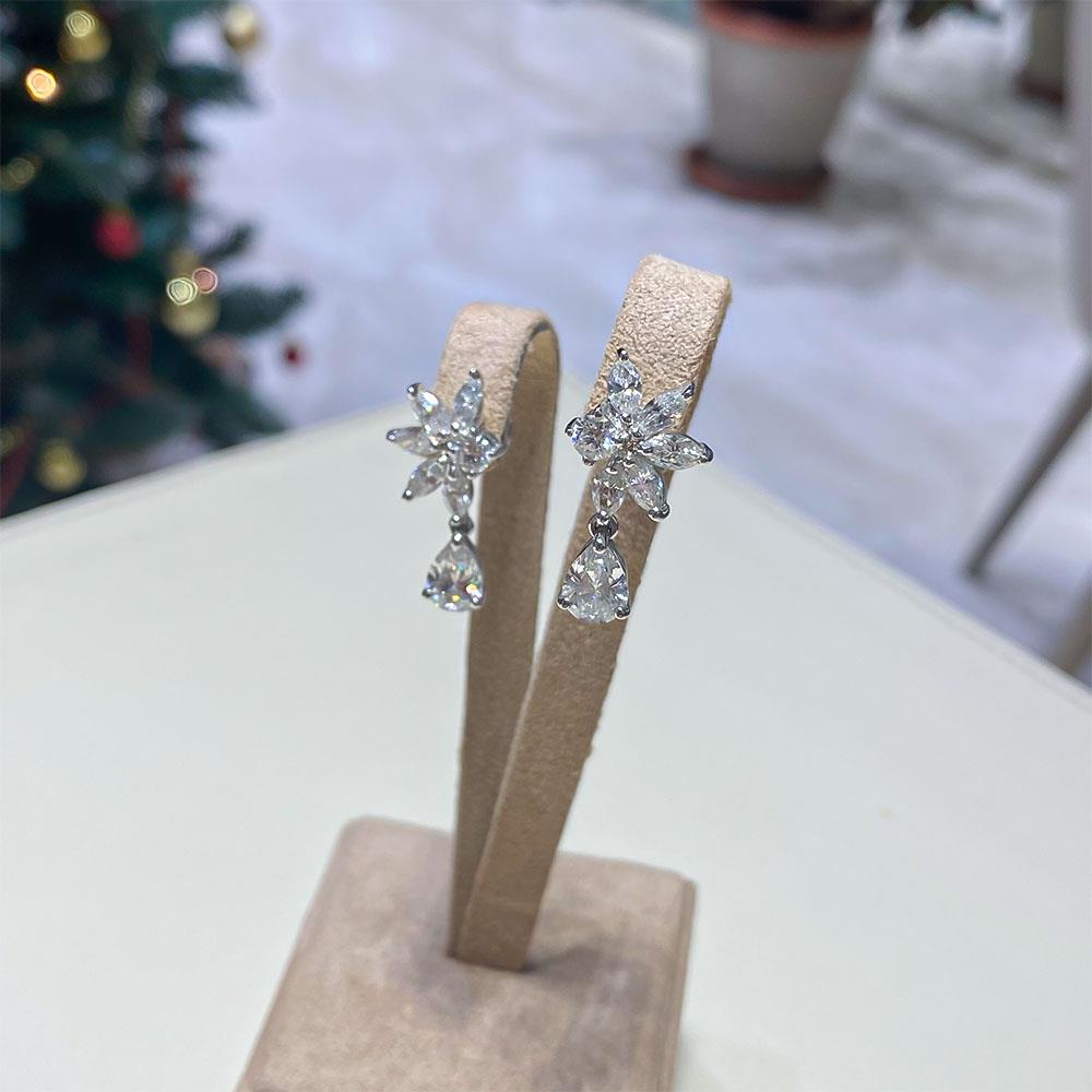 Il fiore copre con raffinatezza il foro dell'orecchio ed è realizzato con diamanti naturali. I luminosissimi petali di ogni fiore sono 5 diamanti con taglio navette. Al centro è presente un diamante con taglio rotondo a brillante. Il pendente è invece un magnifico diamante con taglio a goccia. La chiusura è una solida e pratica chiusura con perno e farfallina. Altezza totale degli orecchini: 24 mm.