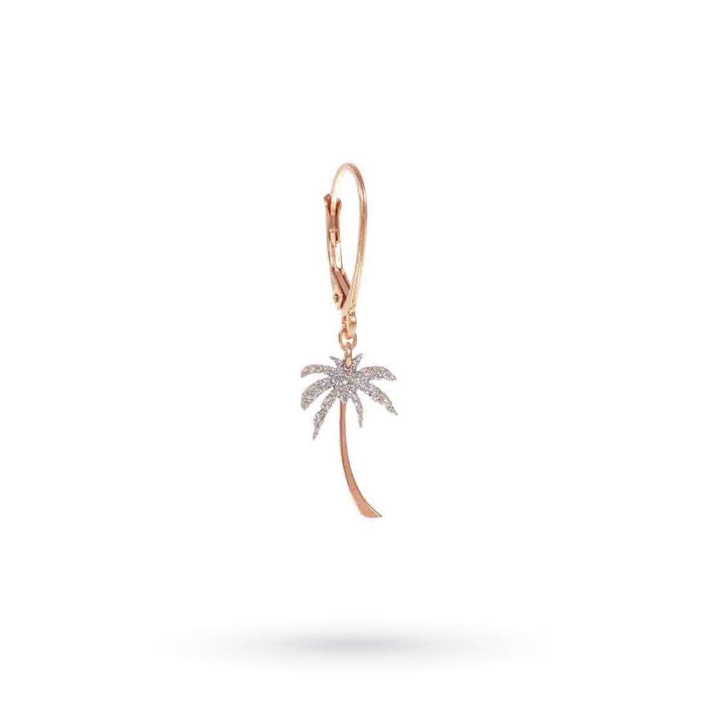 Orecchino singolo a monachella con palma di 1,5 cm in argento 925 placcato in oro rosa ad alto spessore ed alta resistenza, chioma glitter.