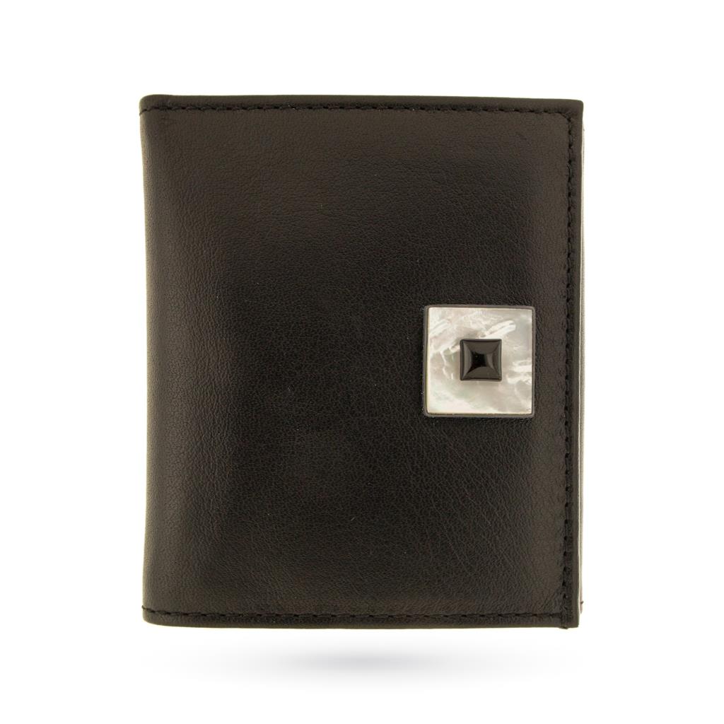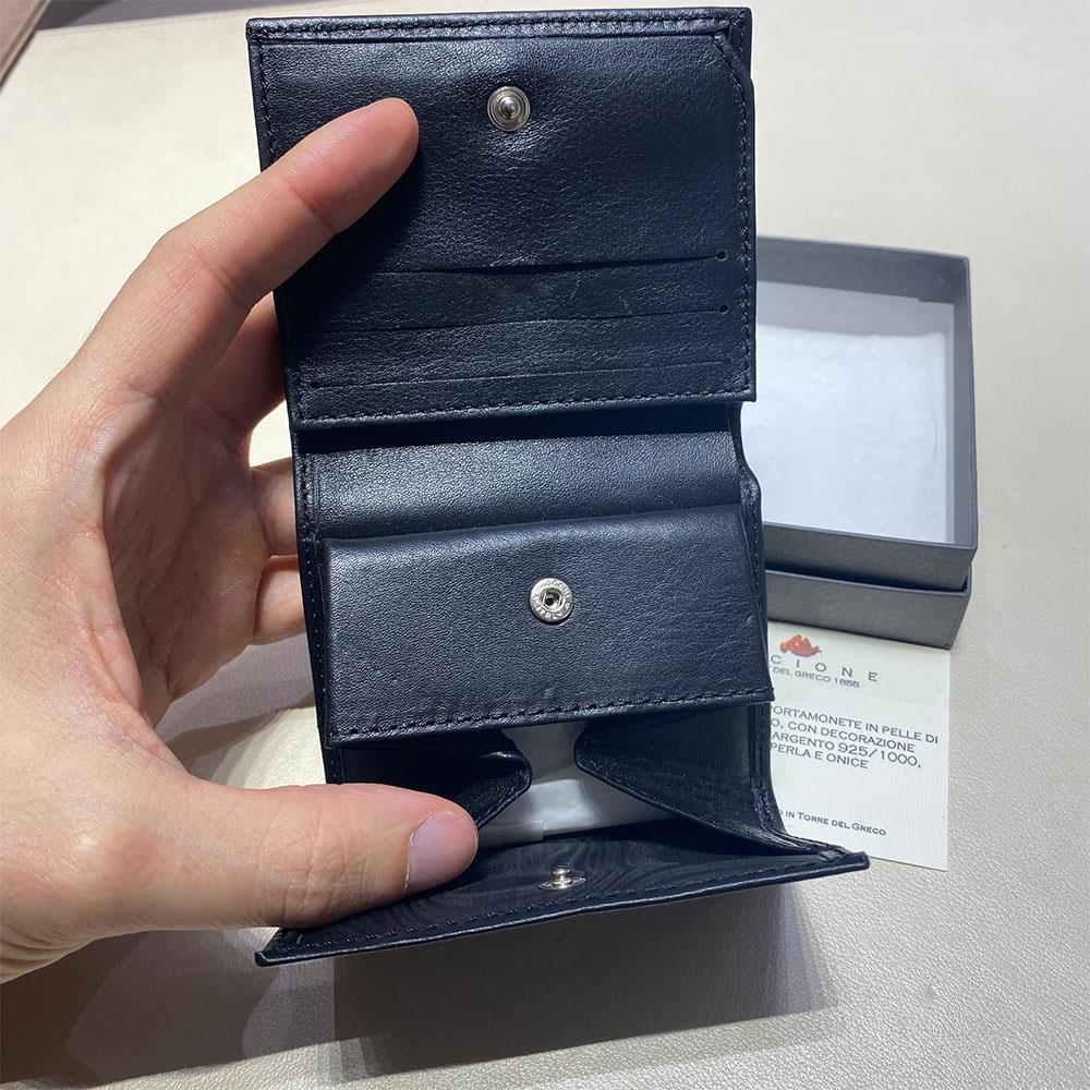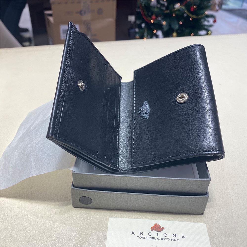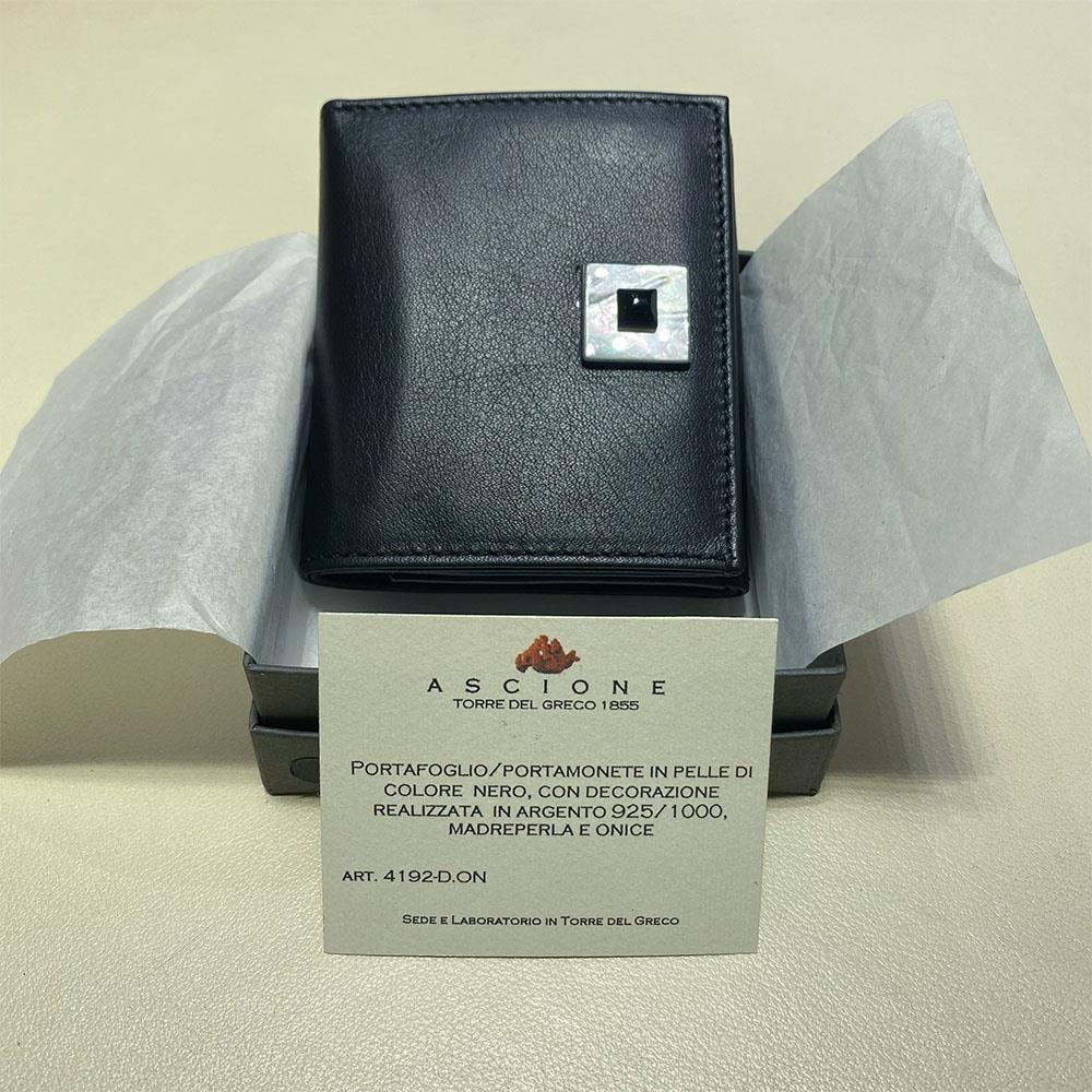Questo portafoglio creato da Ascione è realizzato in pelle nera con cuciture nere.