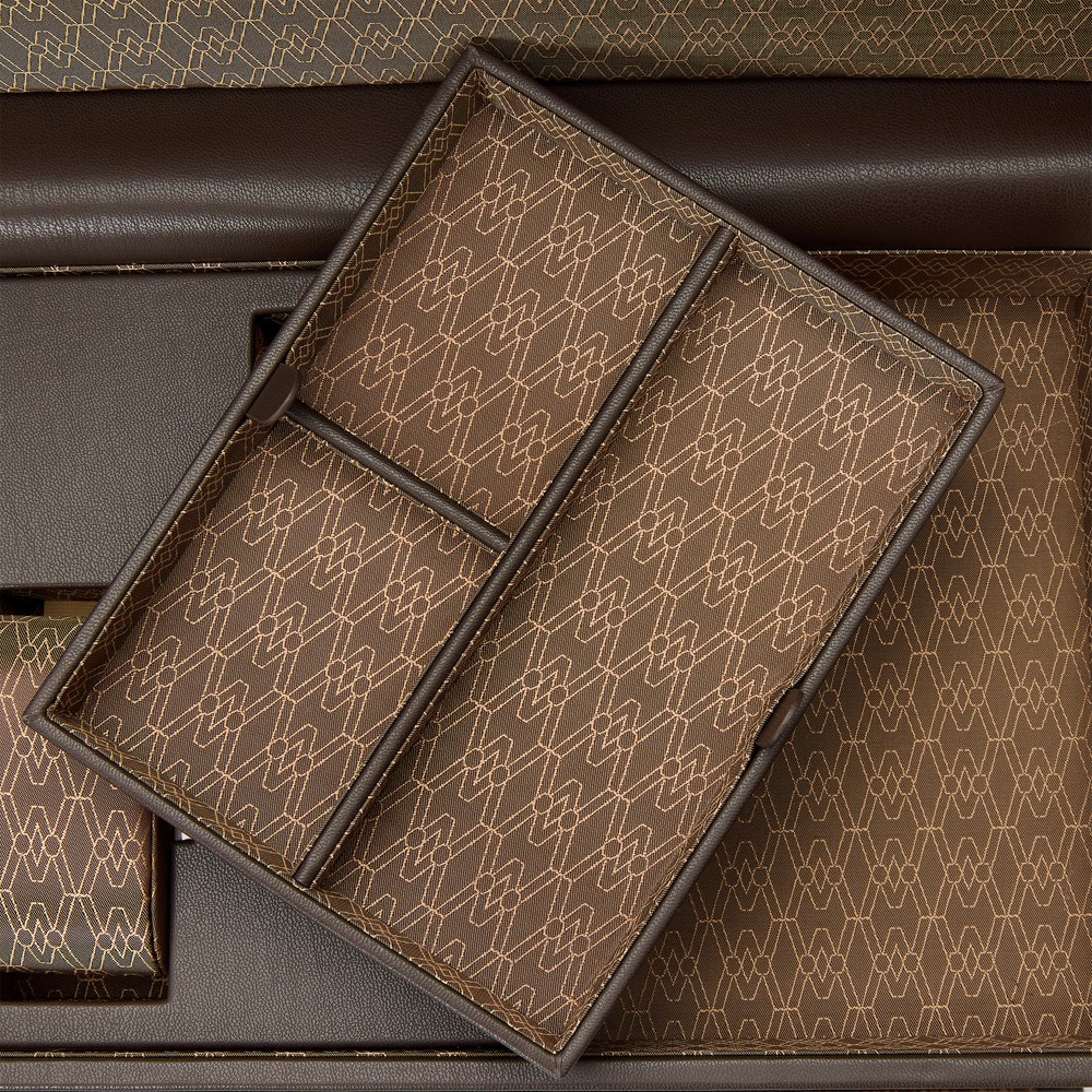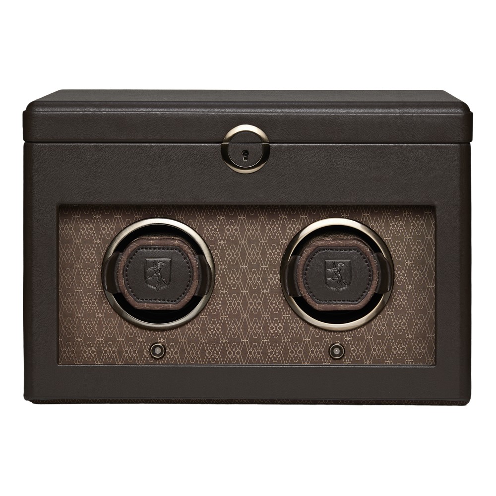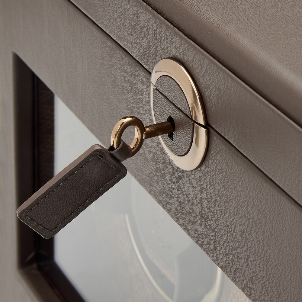 Earth Double Watch Winder unisce design innovativo, eleganza e sostenibilità. Controlla i giri al giorno del tuo avvolgitore tramite l'app Bluetooth WOLF e conserva fino a tre orologi su cuscini sospesi e oggetti di valore nel vassoio portaoggetti rimovibile. Materiale: esterno in pelle vegana Apple con interno in raso Jacquard riciclato, con il motivo distintivo di WOLF. Dimensioni prodotto: 33,7 x 20,3 x 22,9 cm - Peso: 5,32 kg. Riferimento: Wolf 190406.