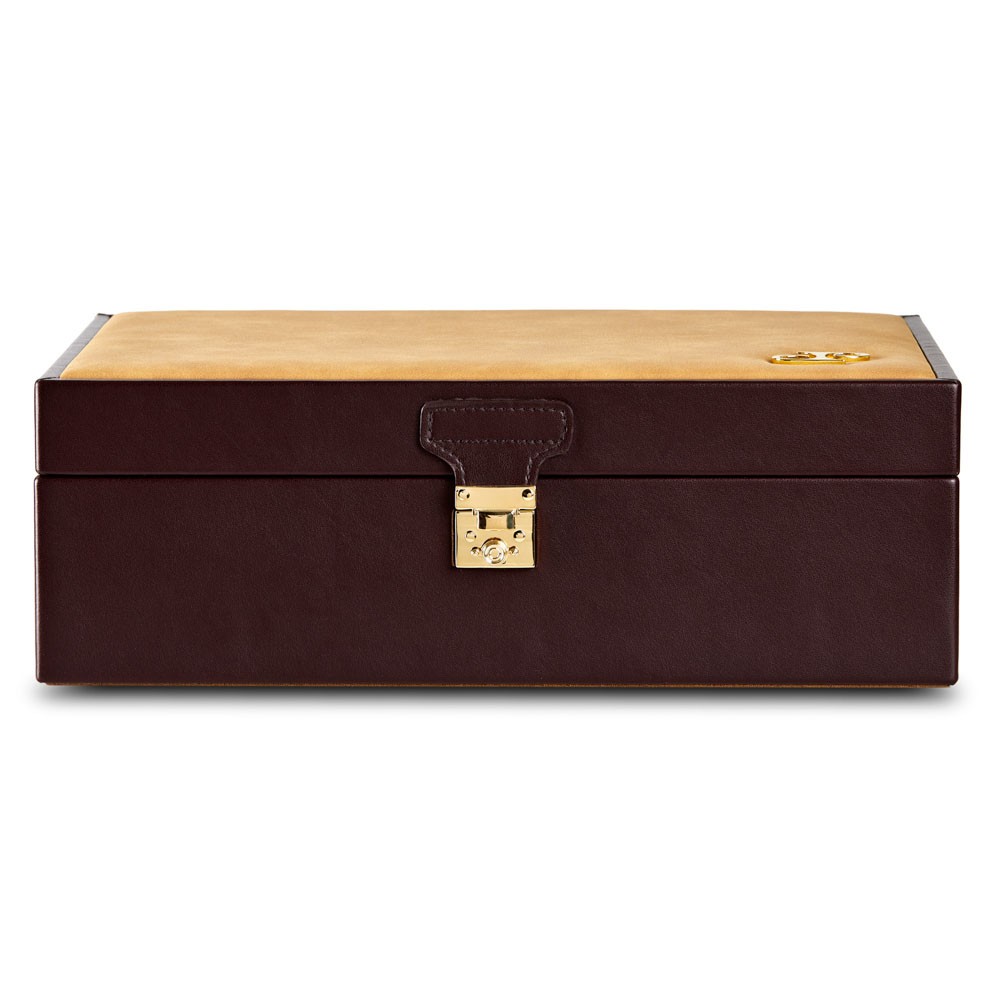 Philipp si ispira alla scatola originale progettata da Philipp Wolf IV negli anni '70. La custodia lifestyle per orologi e gioielli da uomo conserva l'estetica vintage degli anni '70 con un tocco moderno. Con un ricco esterno in pelle vegana marrone e nabuk beige con l'iconico logo "DP" di Design Philipp in finitura oro e una serratura personalizzata per completare il look. L'interno presenta una fodera LusterLocâ„¢ con un vano porta cancelleria a fisarmonica marrone scuro, una tasca con chiusura a scatto e spazio per riporre un porta carte di credito WOLF (non in dotazione). Presenta un singolo polsino sospeso per orologio, un vassoio portaoggetti rimovibile, un vassoio per gemelli/anelli e un grande vassoio per cucchiai. L'accessorio perfetto per l'uomo che ha tutto. Materiale: pelle vegana e nabuk. Dimensioni del prodotto: 30 x 10 x 20 cm - Peso: 3,1 kg. Riferimento: Wolf 190206.