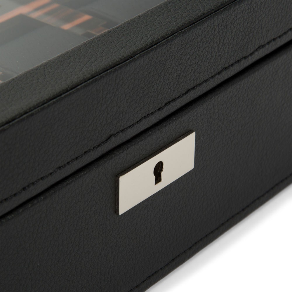 Ispirato alle migliori automobili britanniche, Jaguar, Aston Martin, Bristol e simili. Scatola porta orologi Roadster da 10 pezzi con contenitore rivestita in pelle con dettagli in legno di ebano macassar lucidato. Materiale: pelle vegana. Dimensioni del prodotto: 32,7 x 22,9 x 9,5 cm - Peso: 2,98 kg. Riferimento: Wolf 477556.