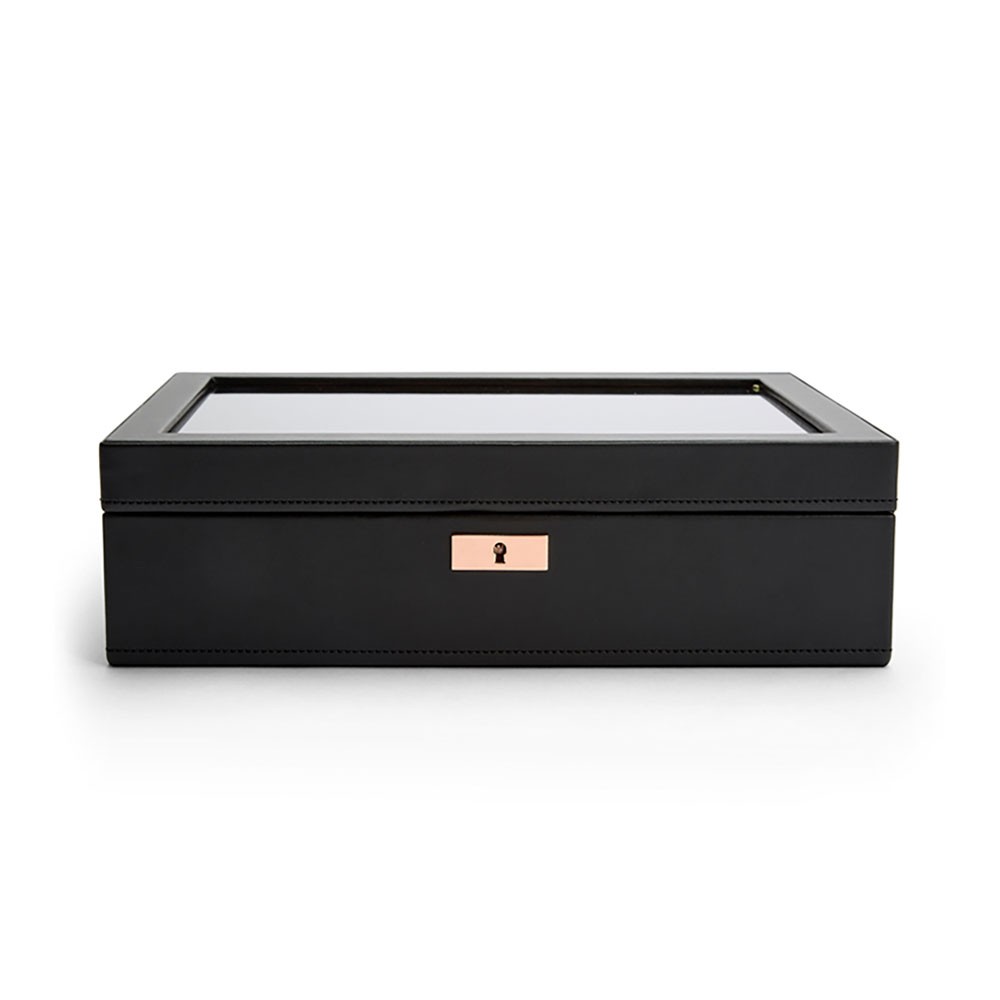 Acciaio perforato tagliato al laser placcato in rame fuso con linee pulite ed eleganti. La collezione Axis sfoggia un look moderno e audace per custodire i tuoi orologi. Tieni i tuoi orologi al sicuro e protetti con stile con questa scatola per orologi Axis da 10 pezzi. Realizzata in pelle vegana, questa scatola per orologi può esporre magnificamente fino a 10 orologi. Dotata di sicurezza con lucchetto e chiave, cuscini per orologi sospesi e una porta USB per smartwatch. Materiale: pelle vegana. Dimensioni del prodotto: 32,7 x 22,9 x 9,5 cm - Peso: 2,98 kg. Riferimento: Wolf 488116.