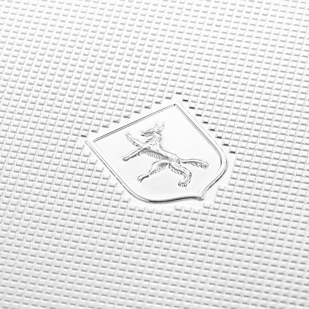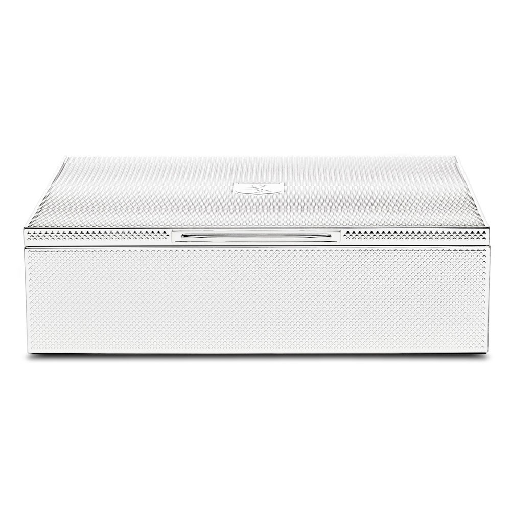 La scatola Silver Watch, Jewellery and Legacy Box si ispira alle scatole d'argento originali di Philipp Wolf I, realizzate nel suo laboratorio di Hanau, in Germania. Silver è la scatola più bella per la tua cassettiera o il tuo tavolino. Placcata in argento con un motivo esterno lavorato a motore, vanta un coperchio nascosto con cerniera a pianoforte e una fodera in ultrasuede blu scuro trattata con LusterLoc™. Con il logo dello stemma del 190° anniversario di WOLF, Silver offre versatilità con vassoi rimovibili, polsini per orologi, slot per anelli e scomparti. Uno squisito pezzo di dichiarazione che celebra l'artigianalità e l'eleganza. Materiale: ferro placcato in argento. Dimensioni del prodotto: 25 x 20 x 7 cm - Peso: 2,9 kg. Riferimento: Wolf 190001.