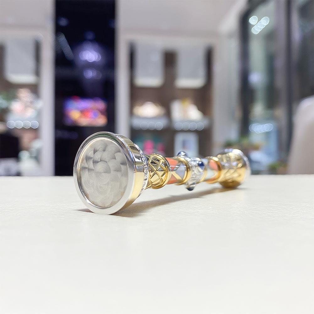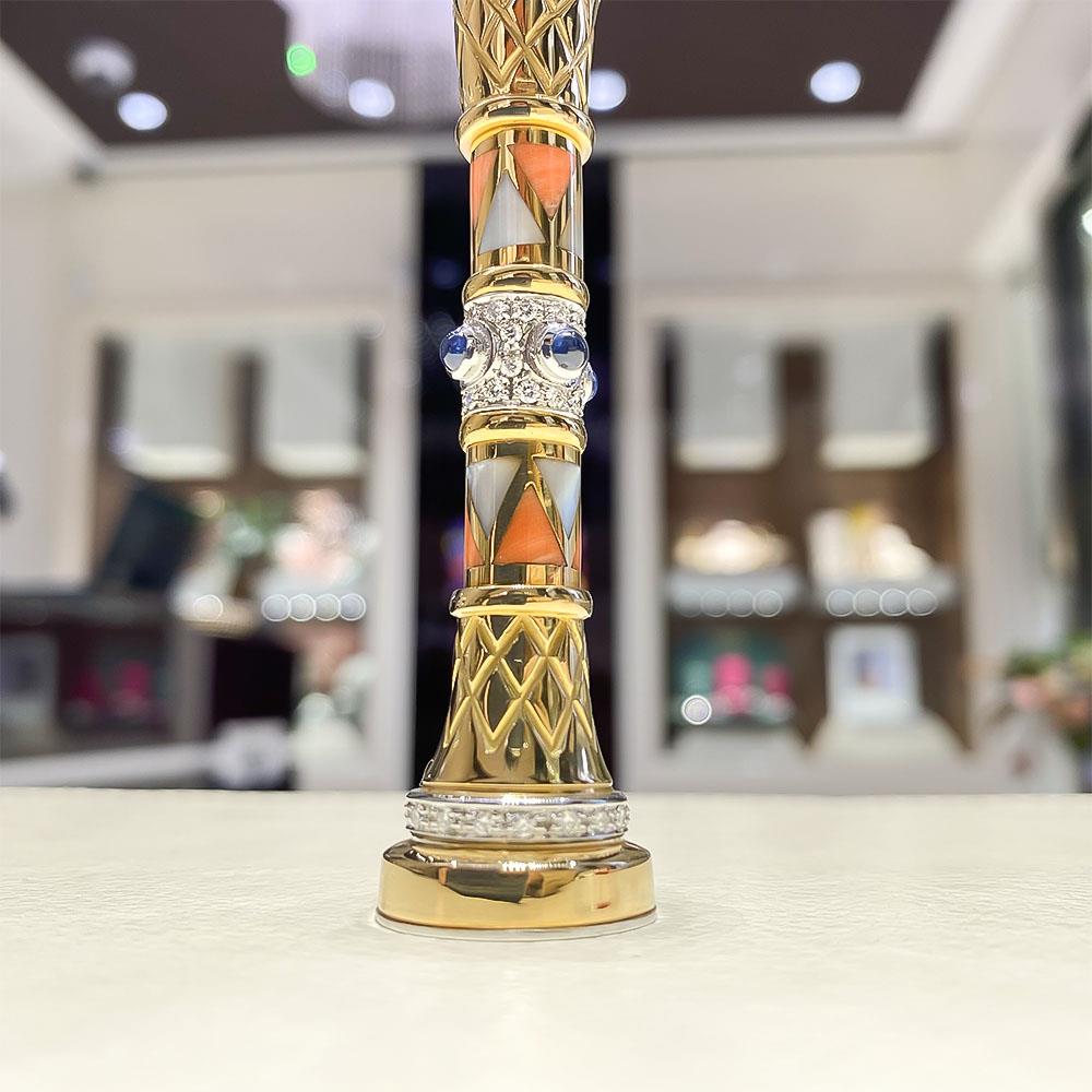 Il sigillo ceralacca è creato interamente in oro. Esso è pieno, in oro massiccio 18kt. La superficie è finemente lavorata con incisioni e intarsi di madreperla tagliati su misura. Sono presenti inoltre intarsi di corallo rossoo, e tutto il cilindro è abbellito da 3 cinture di diamanti. 000050002109All'apice, e sulla cintura centrale, sono posti zaffiri blu con taglio cabochon.