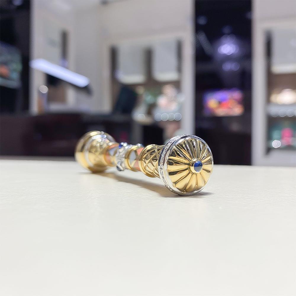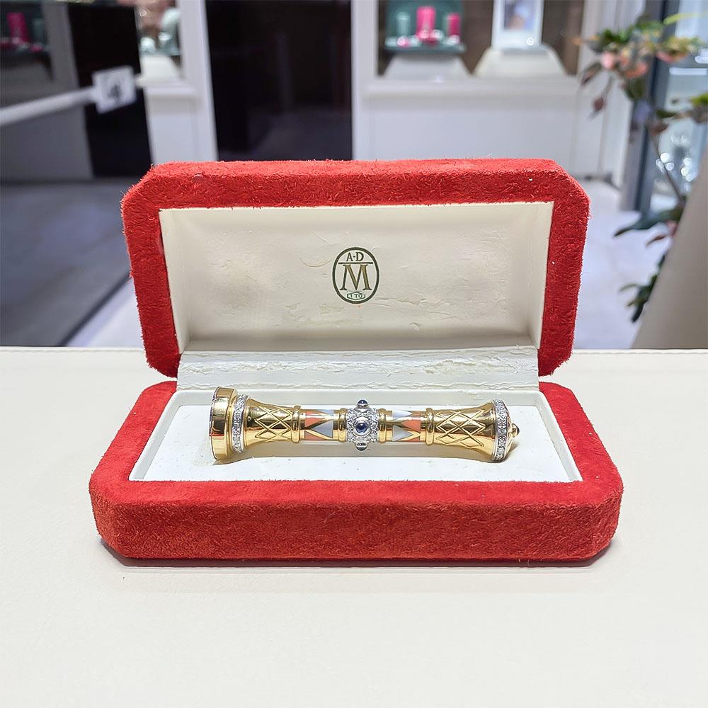 Sigillo per ceralacca oro giallo diamanti zaffiri intarsi. Il gioiello che stai osservando è un sigillo da ceralacca realizzato in prezioso oro giallo 18kt. L'oggetto fa parte del set "i simboli" ed è una edizione limitata numerata creato da MaxArt. Questa opera d'arte è dedicata agli amanti di oggetti incredibili da collezione. Serie numerata con numero 14 - Produzione artigianale anni '90.