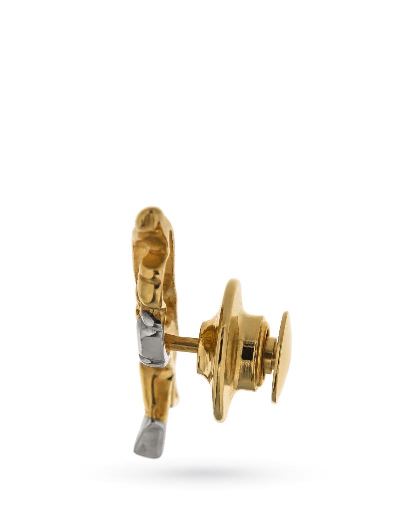Questa spilla da rever è realizzata in oro giallo 18kt, dimensione 2,8 x 0,8 cm.