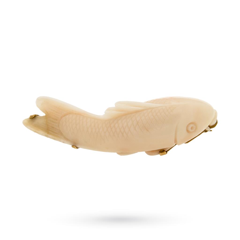 Cicala.it propone oggi questa creazione unica: una spilla in oro 18kt (750/000), grammi 3, con finitura lucida e carpa in corallo rosa incisa a mano da intagliatori di Torre del Greco, patria del corallo. Un gioiello esclusivo, adatto a look particolari, curati e non lasciati al caso. Questa spilla in oro online su www.cicala.it è l'emblema dell'arte manufatturiera del reparto orafo italiano. Non lasciartela scappare.