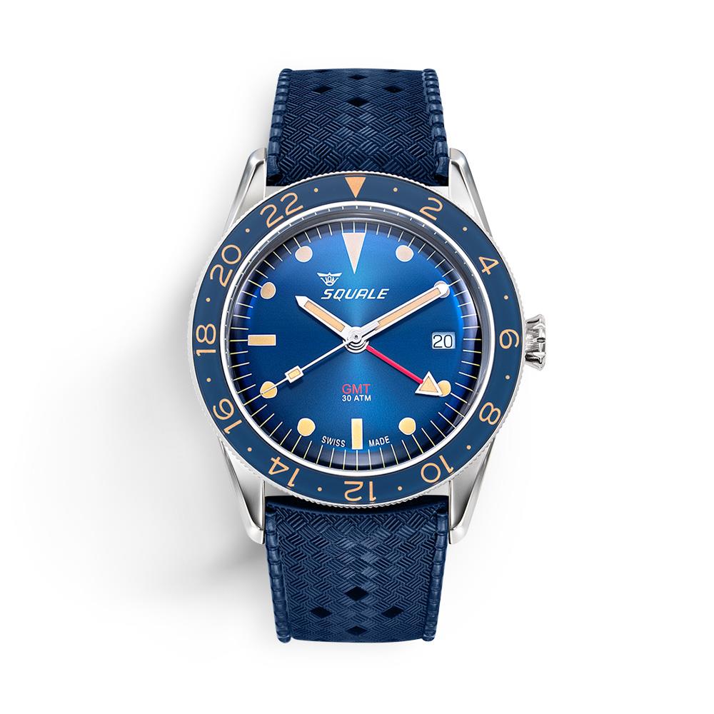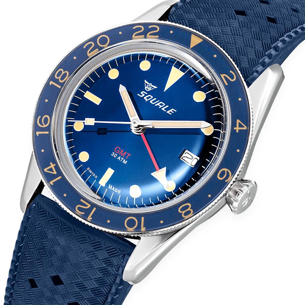Squale Sub-39 GMT Vintage Blu SUB-39GMTB.HTB 40,50 mm. Quest'orologio subacqueo di Squale è realizzato con una cassa in acciaio 316L di forma rotonda con diametro 40,5 mm. La cassa è finemente lucidata e dotata di corona e fondello a vite. Monta un affidabile movimento Sellita SW 330-1 con 48 ore di riserva di carica. Il vetro è zaffiro squadrato antiriflesso, che consente all'osservature una perfetta consultazione dell'orario. La lunetta è bidirezionale in vetro minerale K1. Il quadrante è colorato di un blu acceso, con indici applicati e Superluminova. E' dotato di un cinturino in gomma blu 22-18 mm.