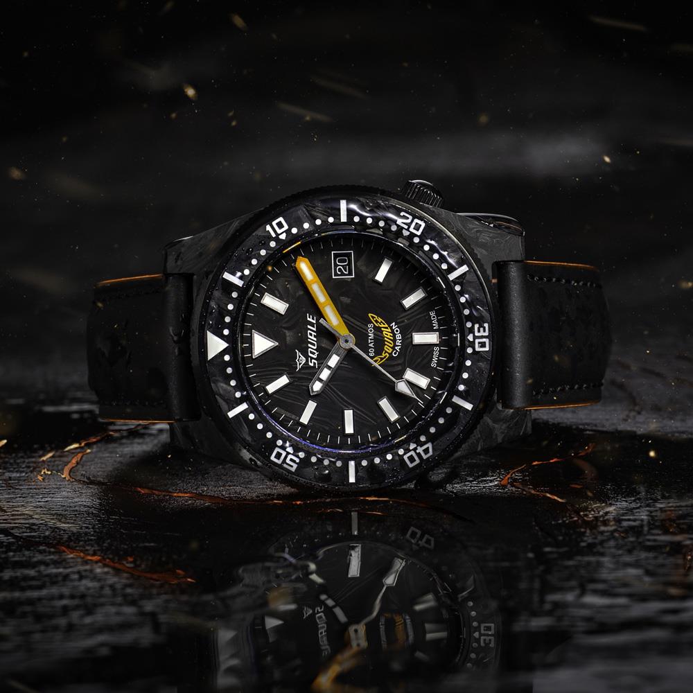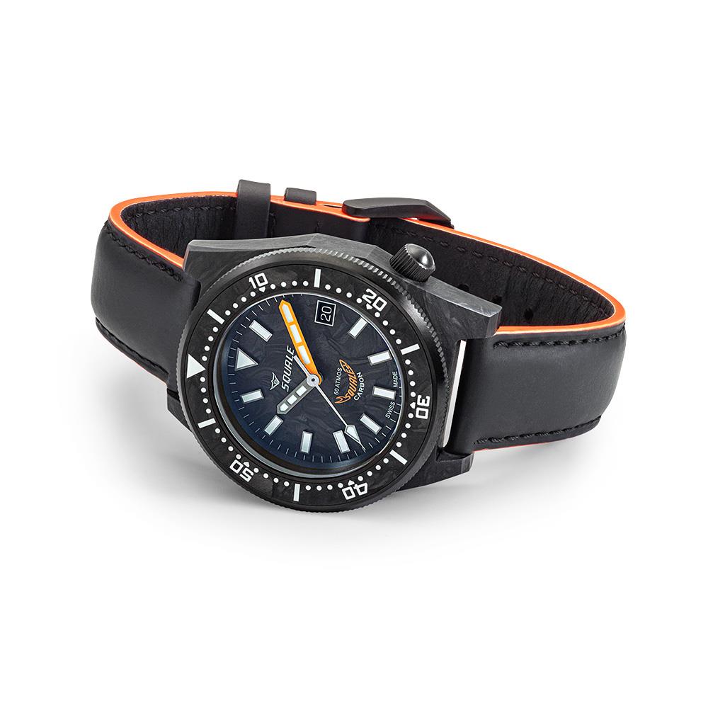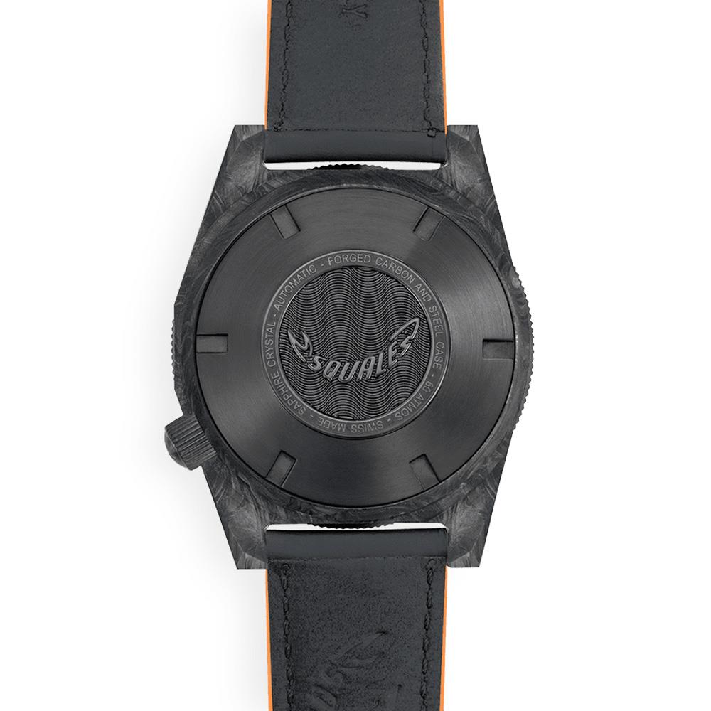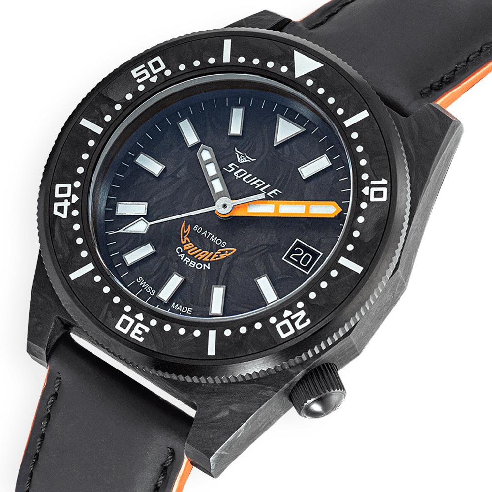 Squale T-183 Foged Carbon Orange T183AFCOR.RLOR 42,00 mm. Quest'orologio da polso di Squale è realizato on una cassa in carbonio forgiato da 42mm. Il fondello e la corona sono a vite, per consentire una perfetta tenuta all'acqua. Monta un affidabile movimento Sellita SW 200-1 automatico con riserva di carica 38h. La lunetta è composta da un inserto anch'esso in carbonio forgiato; quadrante in carbonio con indici applicati con SuperLuminova C3. Cinturino in pelle gommata nera 20-18 mm.