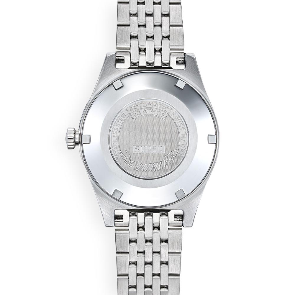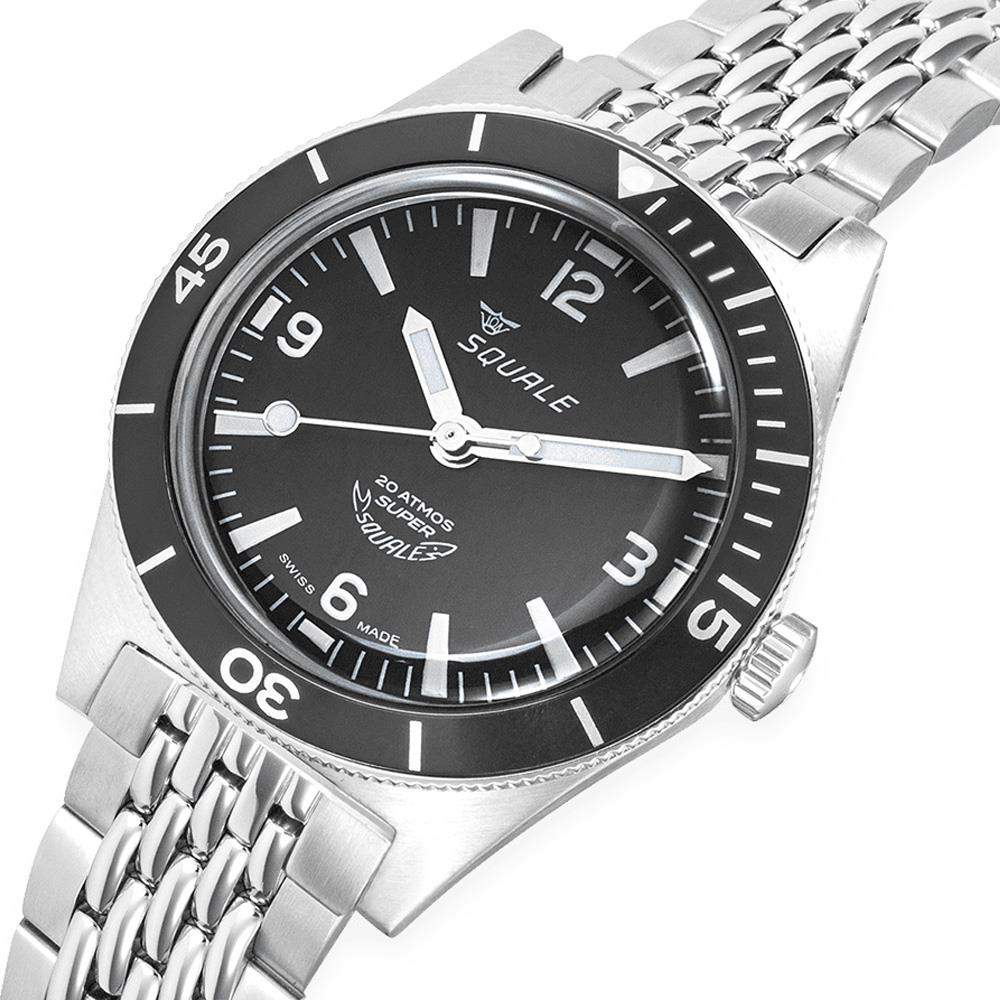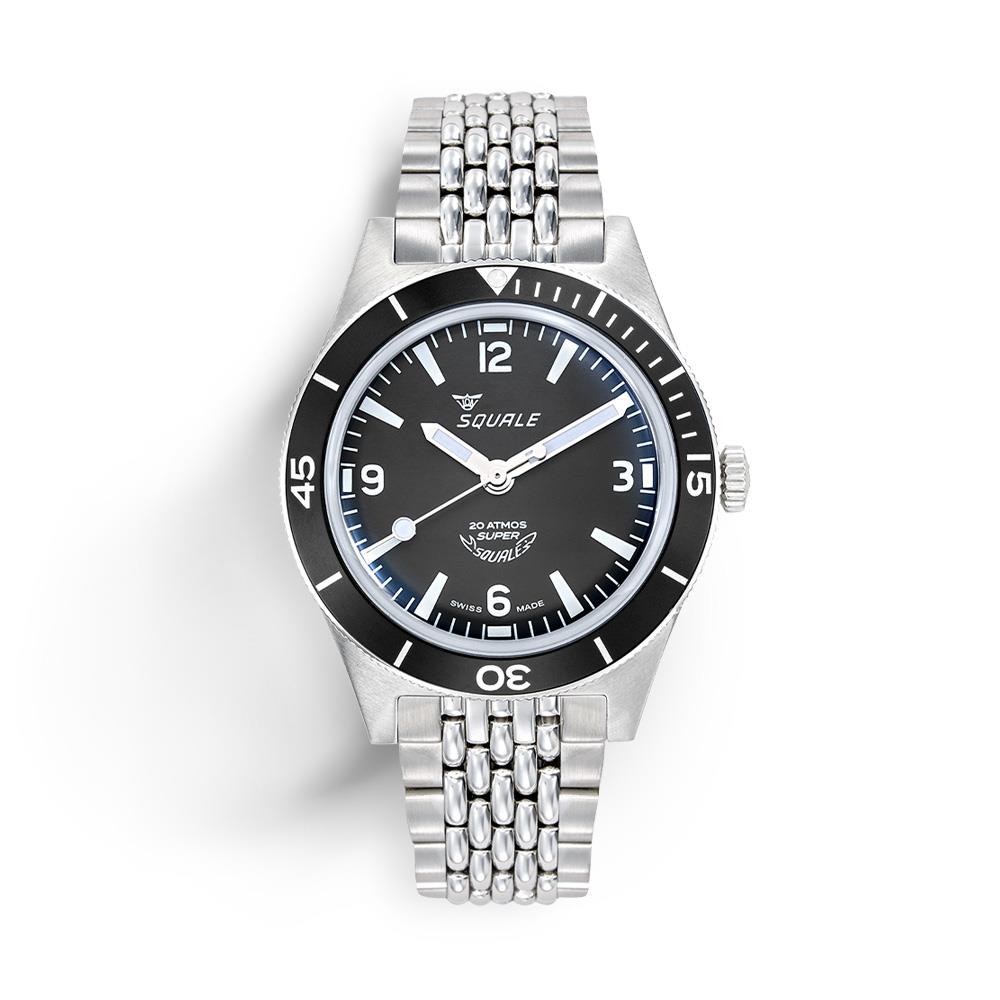 Super-Squale Arabic Numerals Black Bracelet SUPERMBKBK.AC 38,00 mm. Quest'orologio subacqueo di Squale è dotato di una cassa in acciaio 316L con diametro 38mm finemente spazzolata, equipaggiata con corona e fondello a vite per una perfetta tenuta all'acqua. Monta un affidabile movimento Sellita SW200-1 automatico con riserva di carica di 38 ore. Il vetro è zaffiro con doppia bombatura e trattamento antiriflesso; lunetta monodirezionale in alluminio. Il quadrante, molto facile da leggere, ha indici applicati e Superluminova, per una facile consultazione dell'orario anche in assenza di luce.