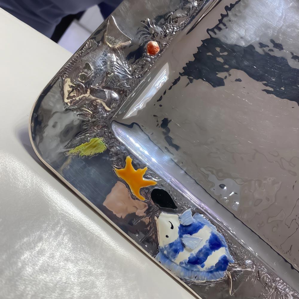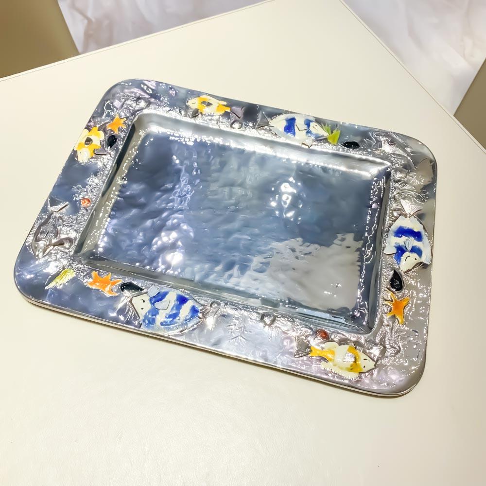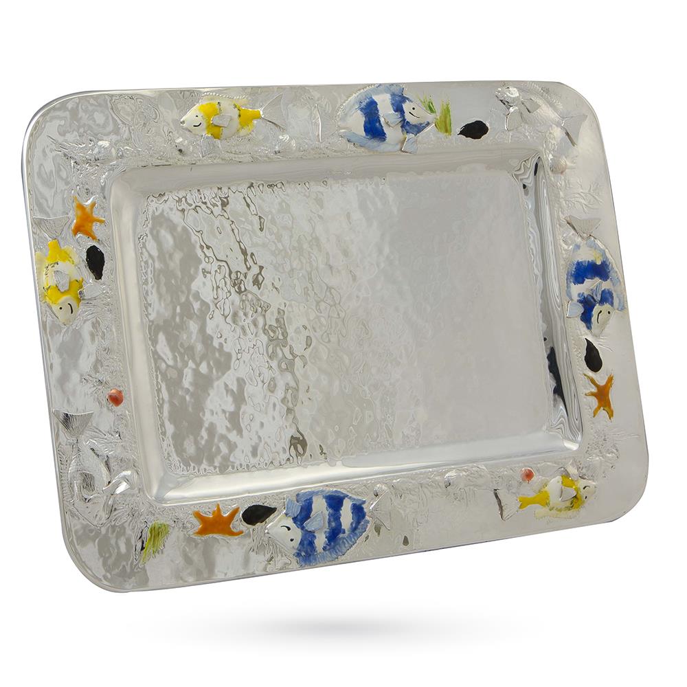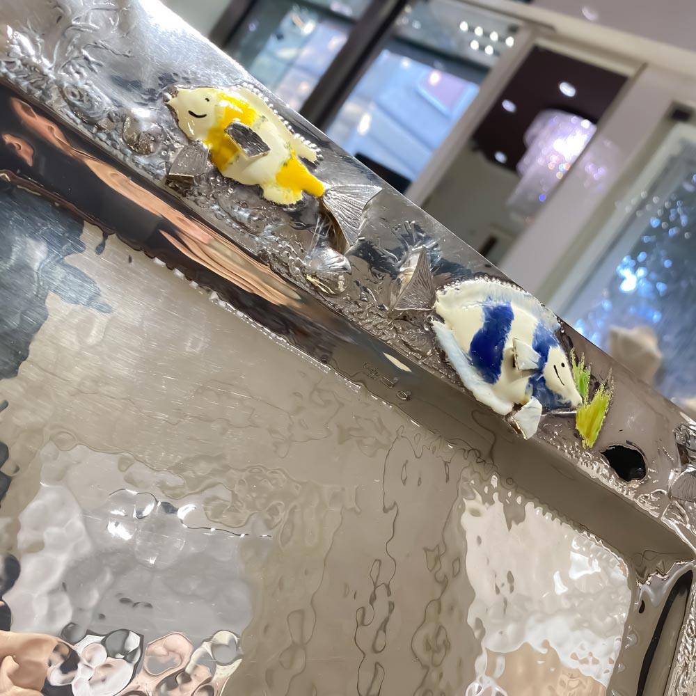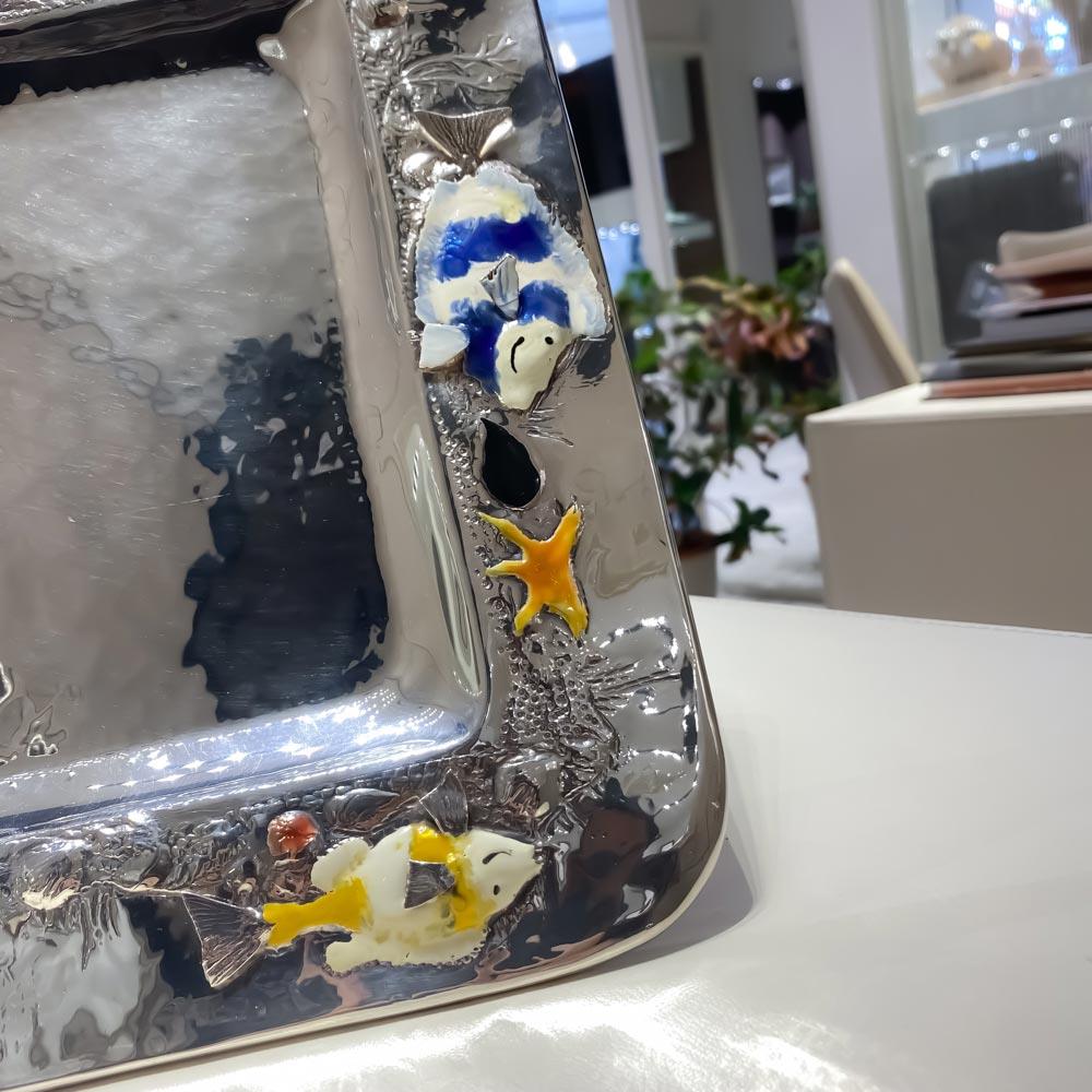 Quello che stai osservando è uno splendido vassoio firmato Italo Gori realizzato in argento 925 e impreziosito da smalti colorati raffiruranti raffinati pesci tropicali smaltati a mano.